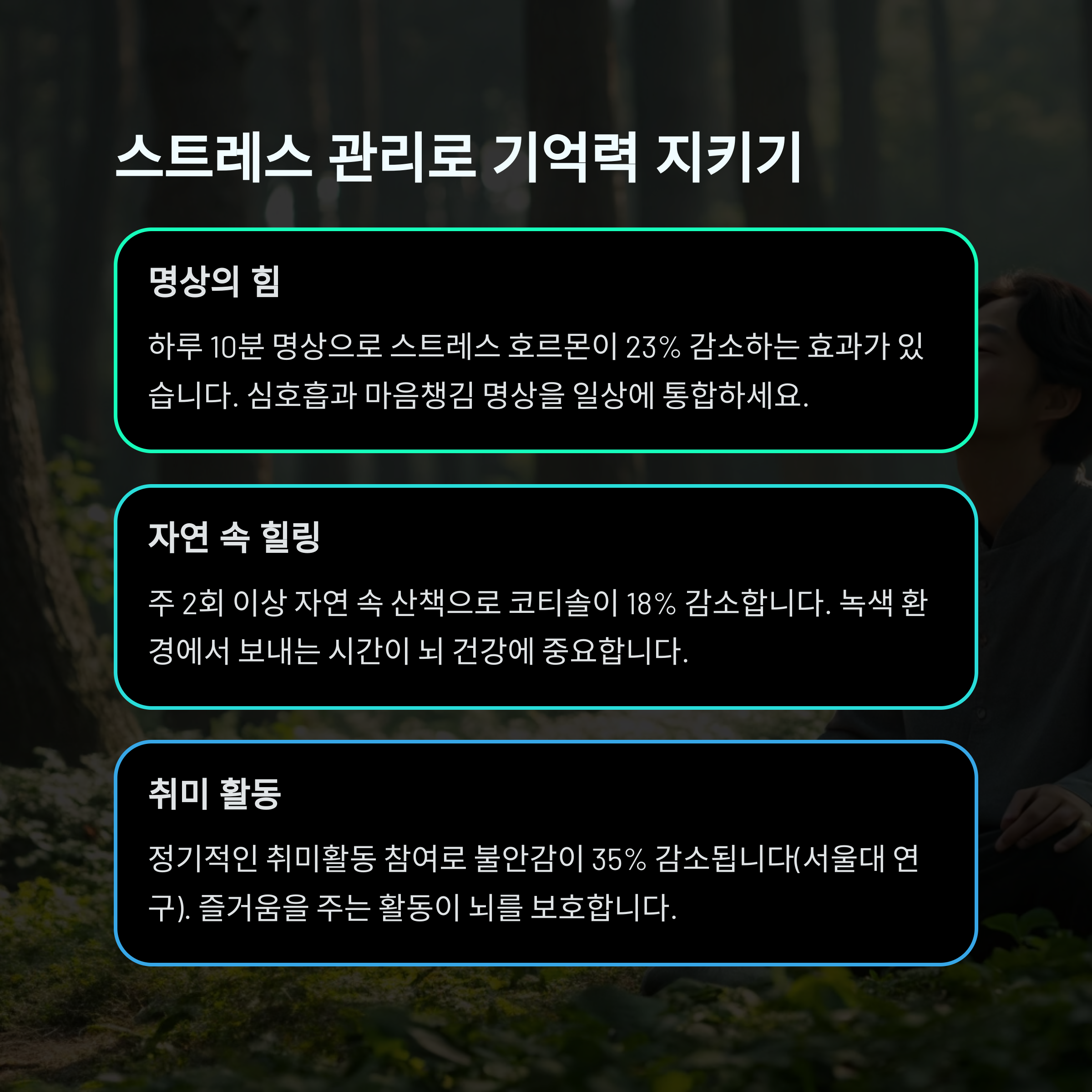 명상, 심호흡, 가벼운 산책이 스트레스 해소에 큰 도움이 됩니다.
