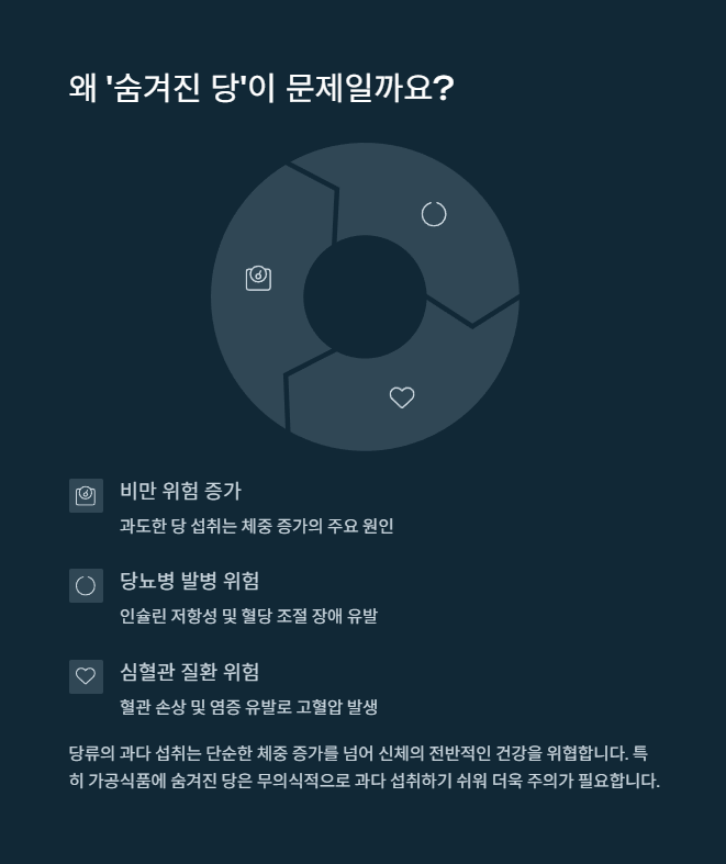 눈치채지 못한 채 섭취되기 때문에 관리가 어렵고, 당 과잉 섭취로 인한 질병 위험을 높입니다.