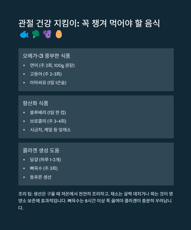 관절 건강을 위한 식사는 단순히 몇 가지 음식을 더 먹는 것이 아니라, 전체적인 균형이 중요해요. 하루 세끼 속에서 항염 성분을 고르게 배치해 보세요.