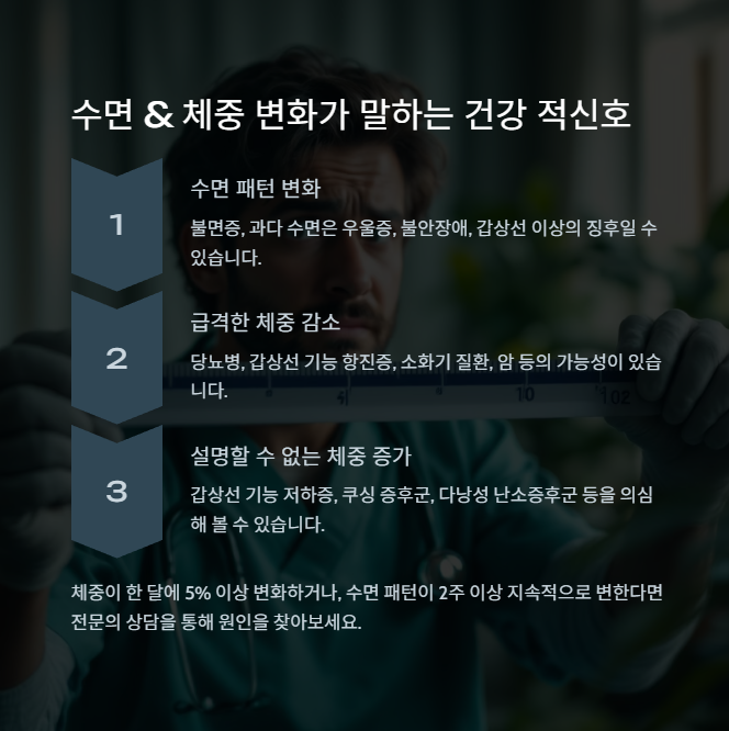 체중 변화는 대사 기능 이상, 갑상선 질환, 당뇨 초기 등과 연결될 수 있습니다. 갑작스러운 변화가 있다면 꼭 검진을 받아보세요.