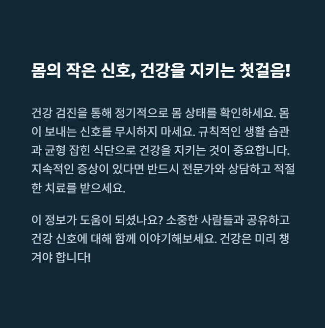 살다 보면 우리 몸에서 보내는 조용한 경고들을 그냥 지나치기 쉽죠. 하지만 오늘 소개한 7가지 신호는 단순한 증상이 아닌, 여러분 건강의 방향을 알려주는 나침반일 수도 있습니다. 혹시 지금 떠오르는 증상이 있다면, 오늘을 계기로 한 번쯤 건강을 점검해 보는 건 어떨까요? 댓글로 여러분의 경험도 함께 나눠 주세요. 우리 같이 건강 지켜요 :)