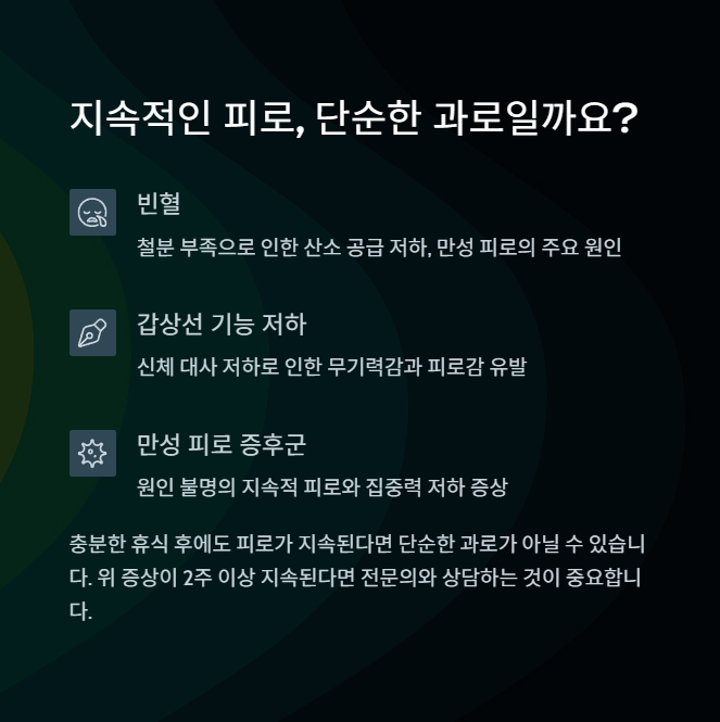 3일 이상 휴식을 취했음에도 피로가 계속된다면 건강 검진을 받아보는 것이 좋습니다. 갑상선, 빈혈, 간 기능 등 다양한 요인이 있을 수 있습니다.