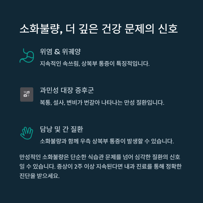 소화기 외에도 간, 췌장, 장의 염증 등 다양한 요인으로 인해 소화불량이 발생할 수 있어 정확한 검사가 필요합니다.