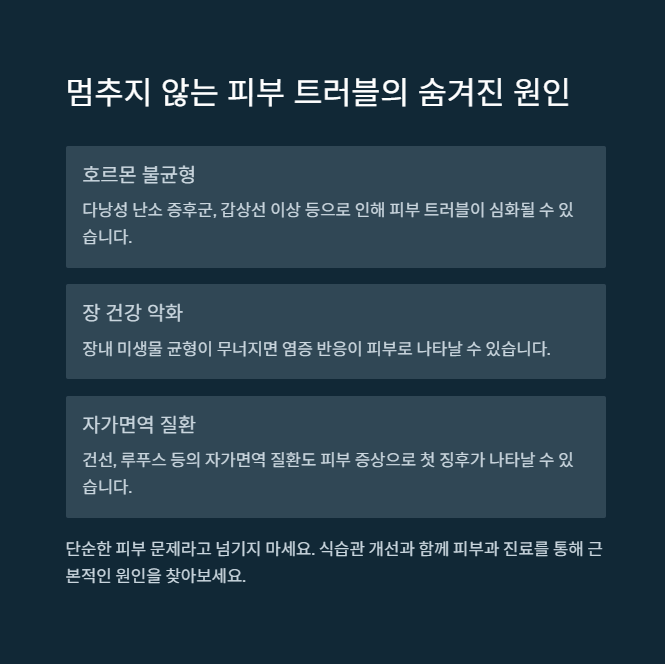 피부에 드러난 문제일 수 있지만, 호르몬 불균형이나 간 기능 이상 같은 내부 문제의 신호일 가능성도 있습니다.