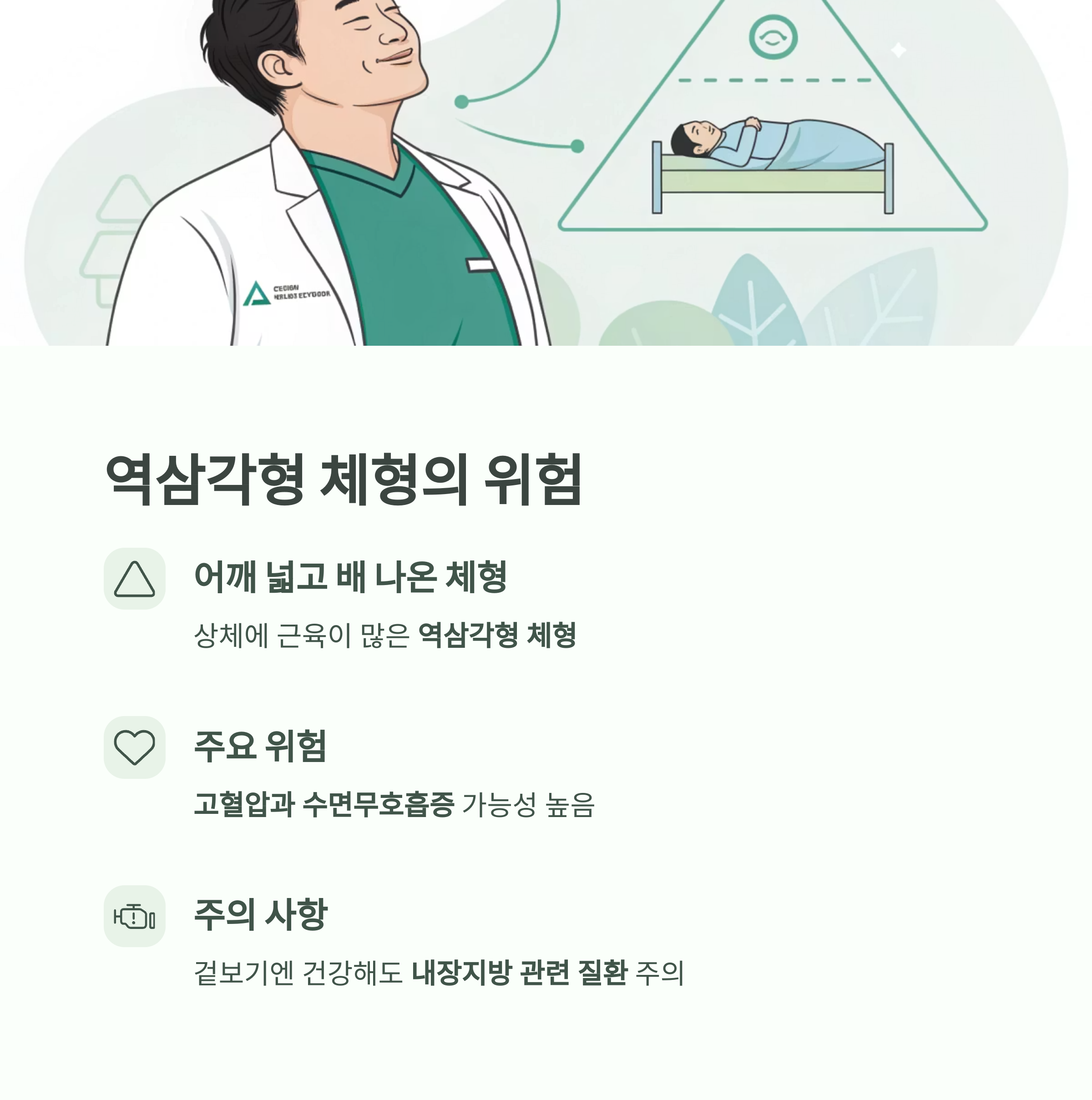 | 역삼각형 | 수면무호흡증, 고혈압 | 상체 비대와 복부 비만의 조합 |