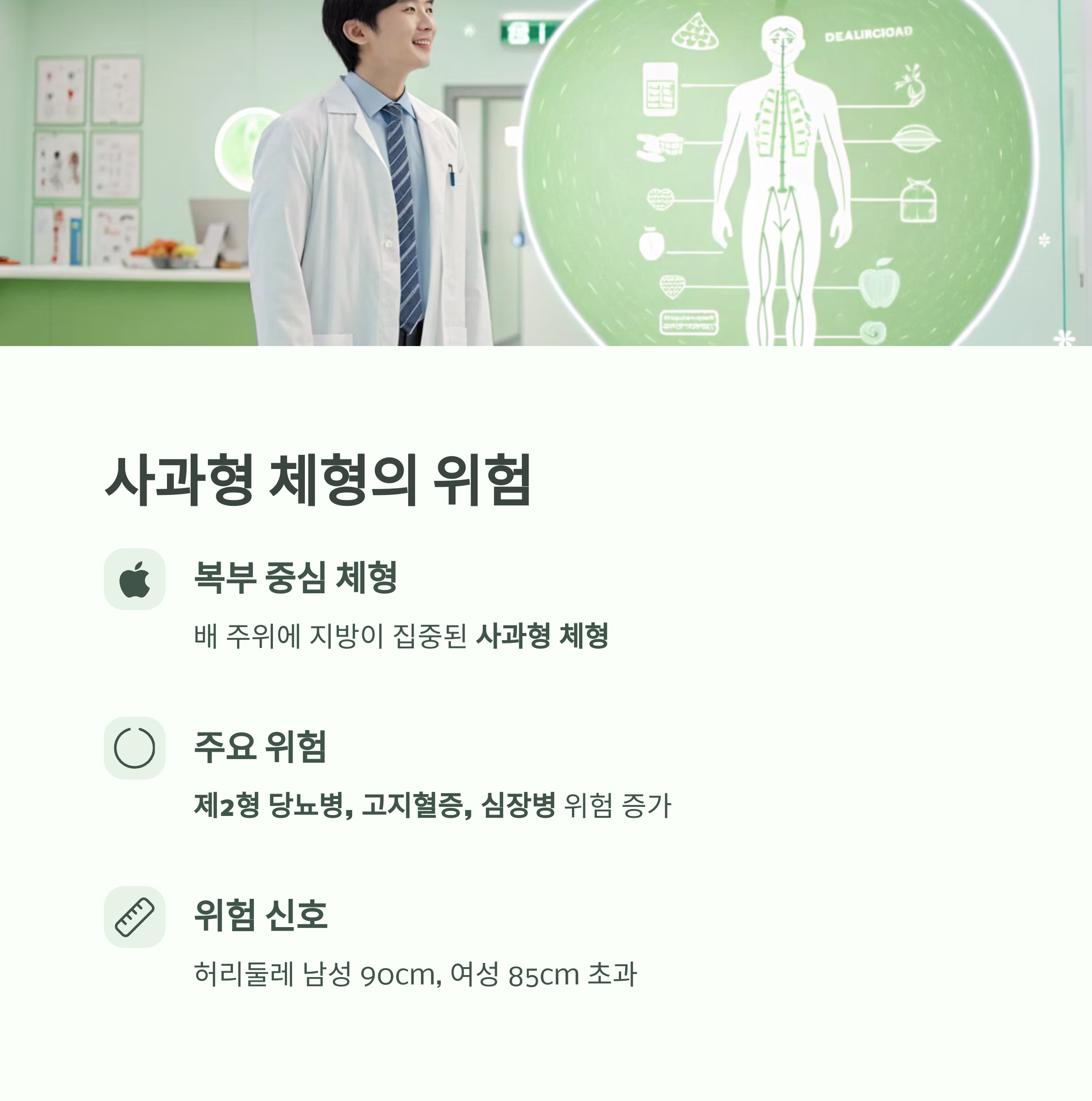 | 사과형 | 당뇨병, 심장병 | 내장지방 증가로 인한 인슐린 저항성 |
