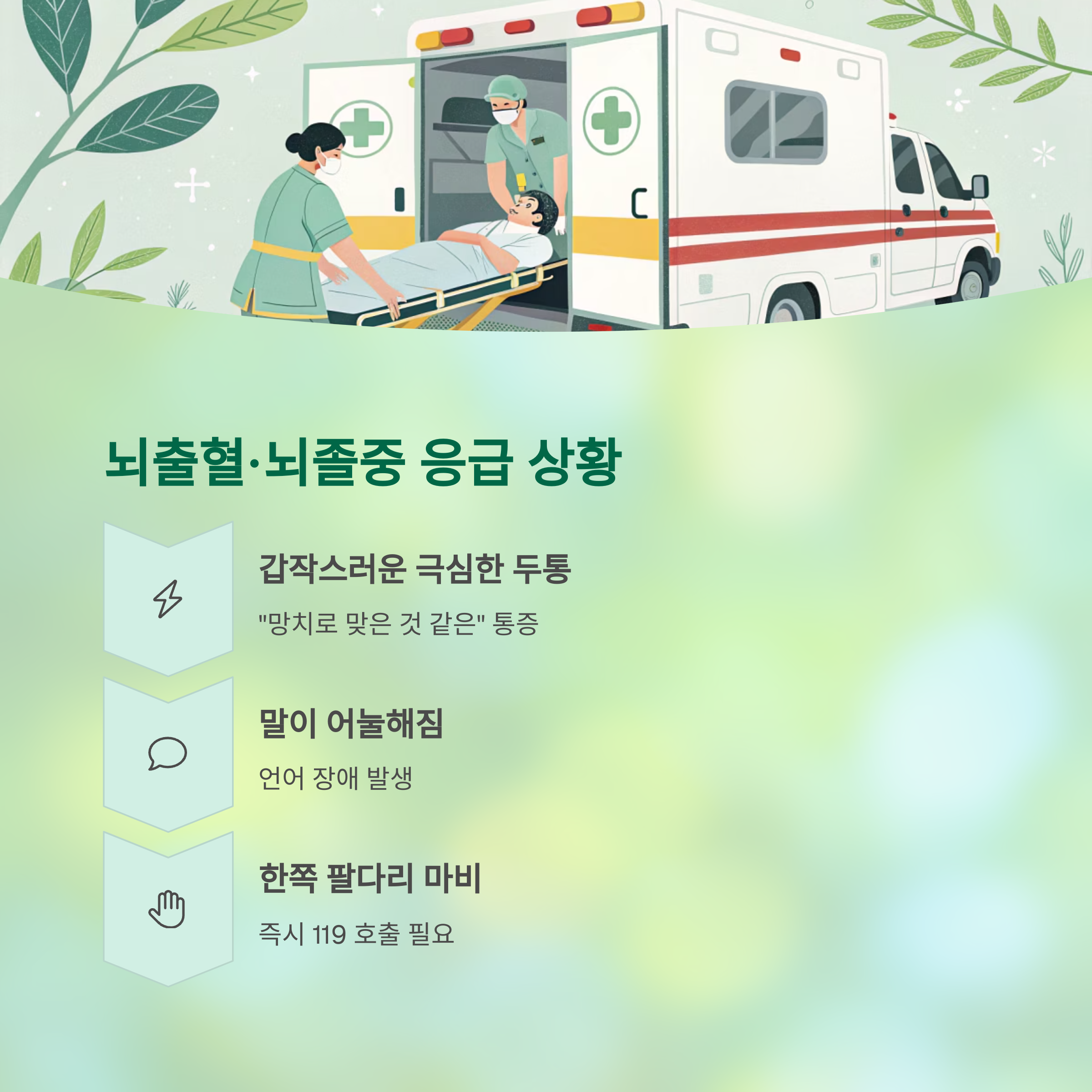 뇌출혈, 뇌경색, 지주막하출혈 등 가능성을 고려해야 합니다.