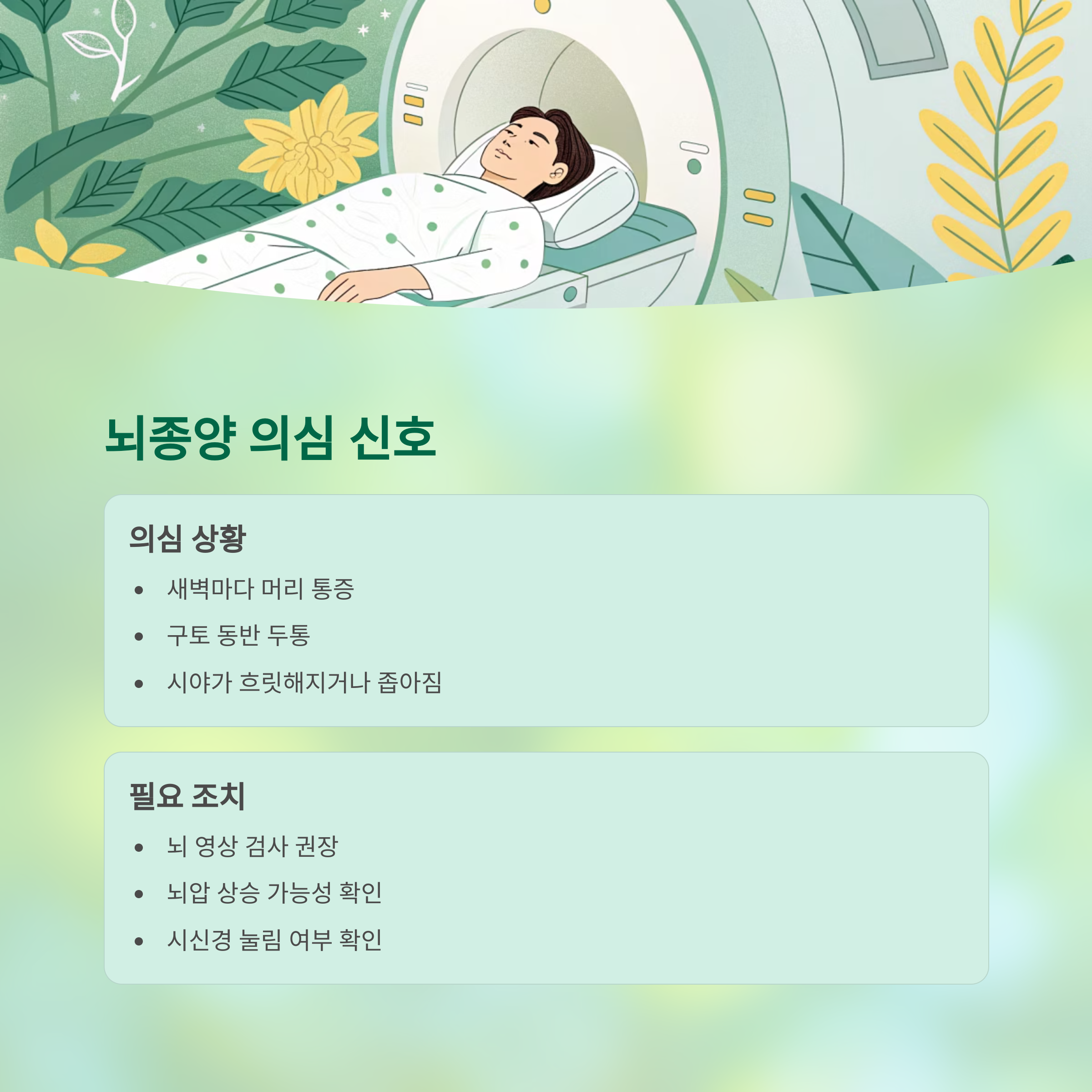 | 새벽마다 머리 통증 | 뇌 영상 검사 권장 |