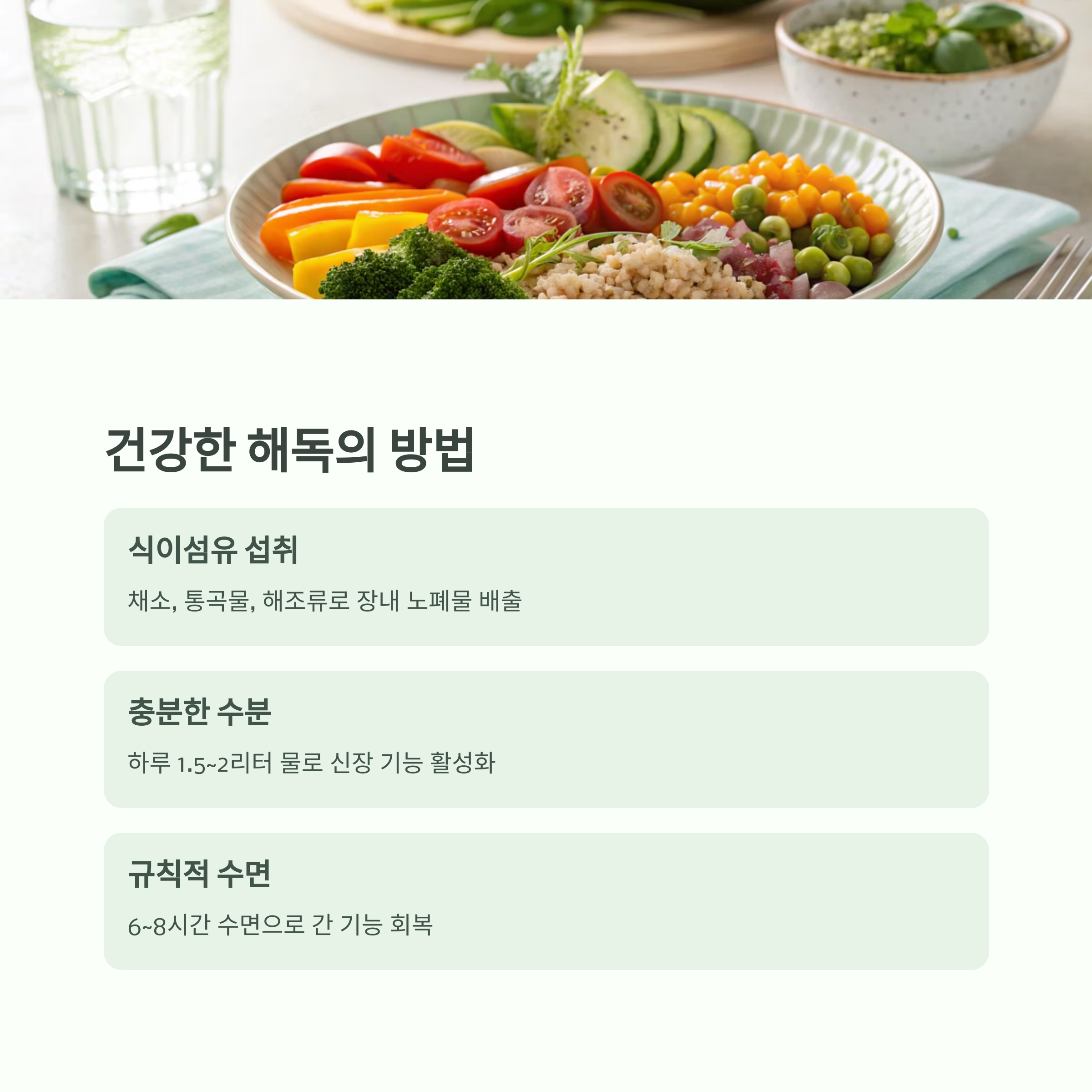 | 규칙적 수면 유지 | 매일 6~8시간 일정한 수면 시간 확보 | 간 기능 회복, 면역력 증진 |
