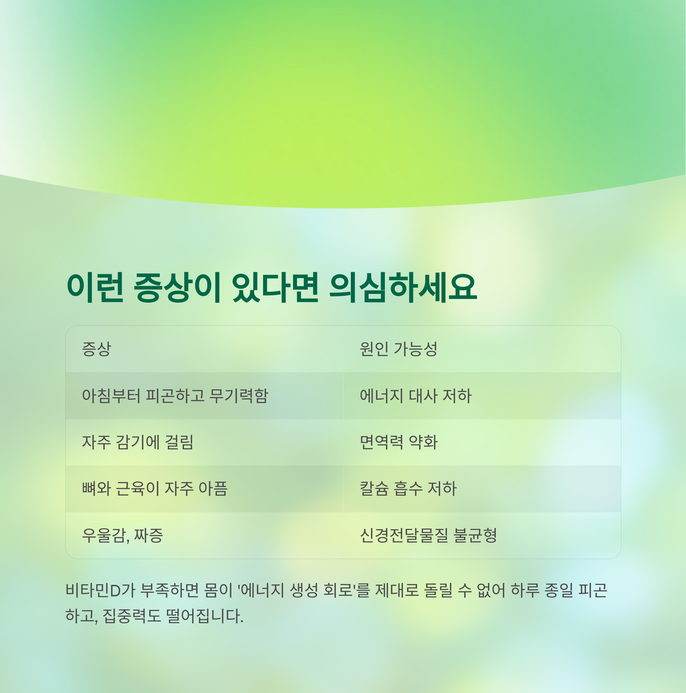 비타민D가 부족하면 몸이 '에너지 생성 회로'를 제대로 돌릴 수 없습니다.