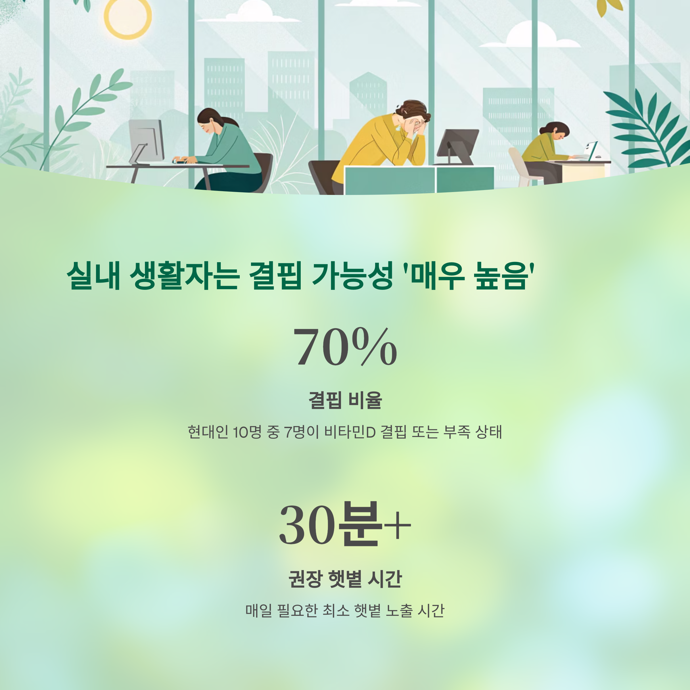 특히 사무직, 학생, 실내 근무자는 햇볕을 거의 쬐지 않아
