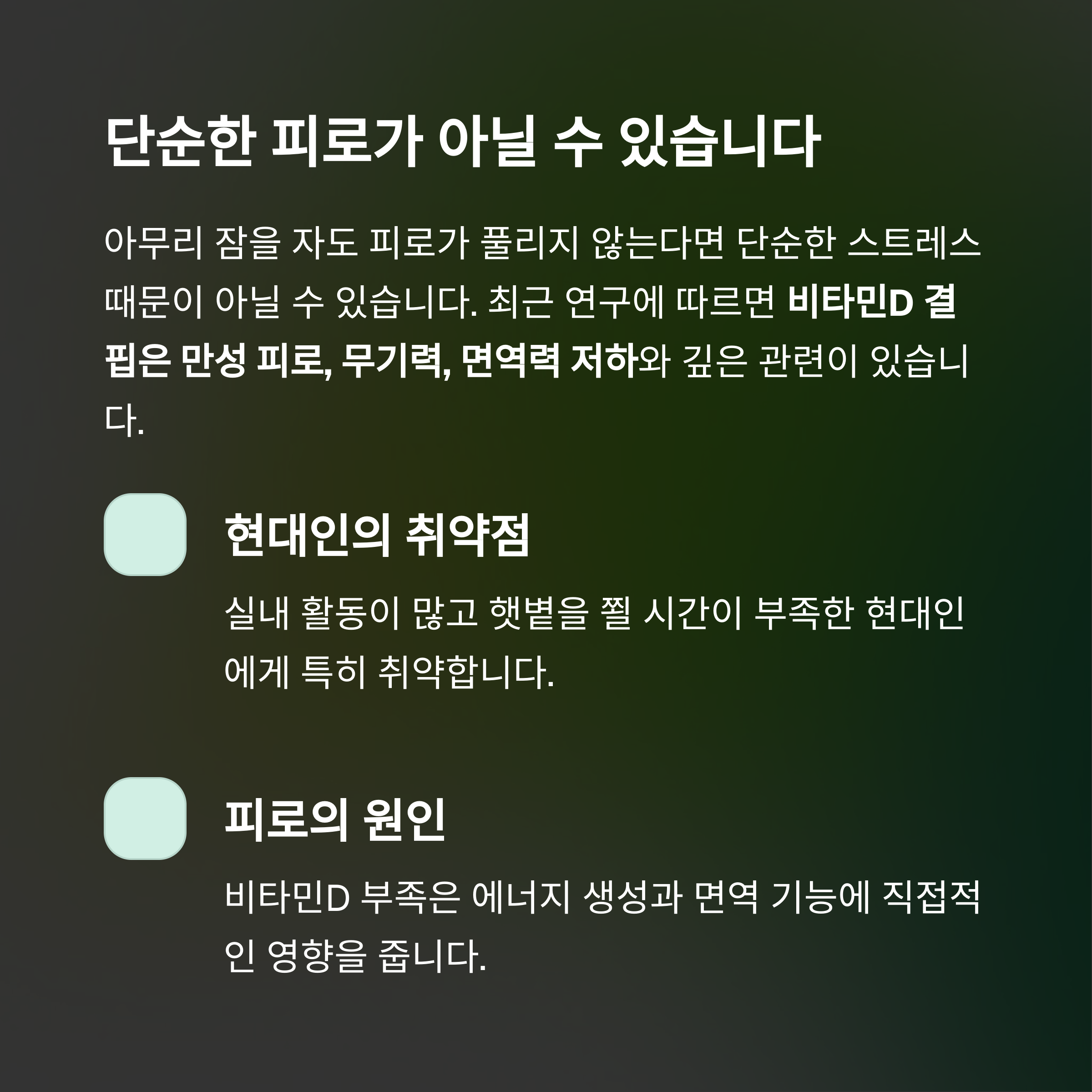 최근 연구에 따르면 비타민D 결핍은 만성 피로, 무기력, 면역력 저하와 깊은 관련이 있습니다.