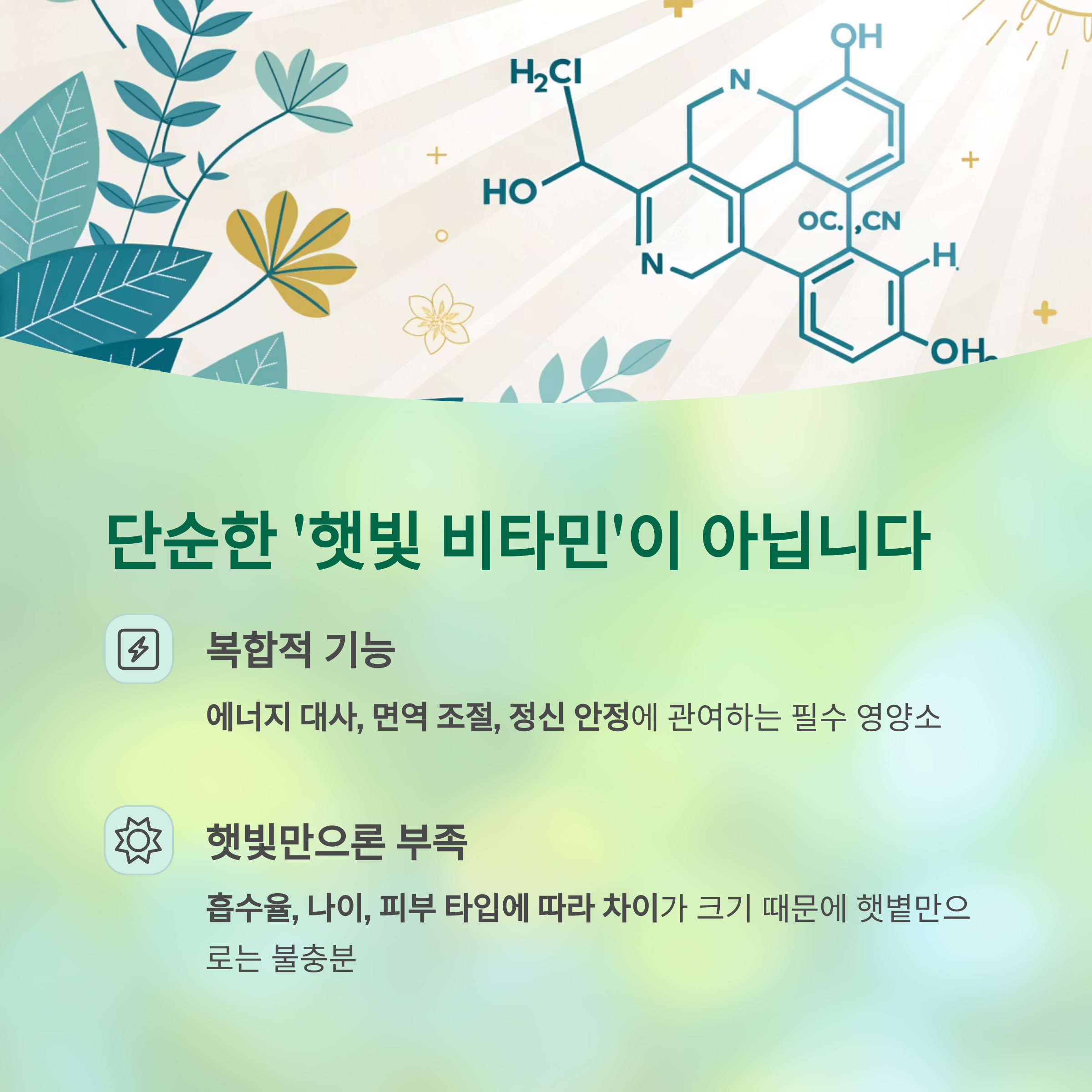 비타민D는 뼈 건강뿐 아니라 에너지 대사, 면역 조절, 정신 안정에까지 관여하는