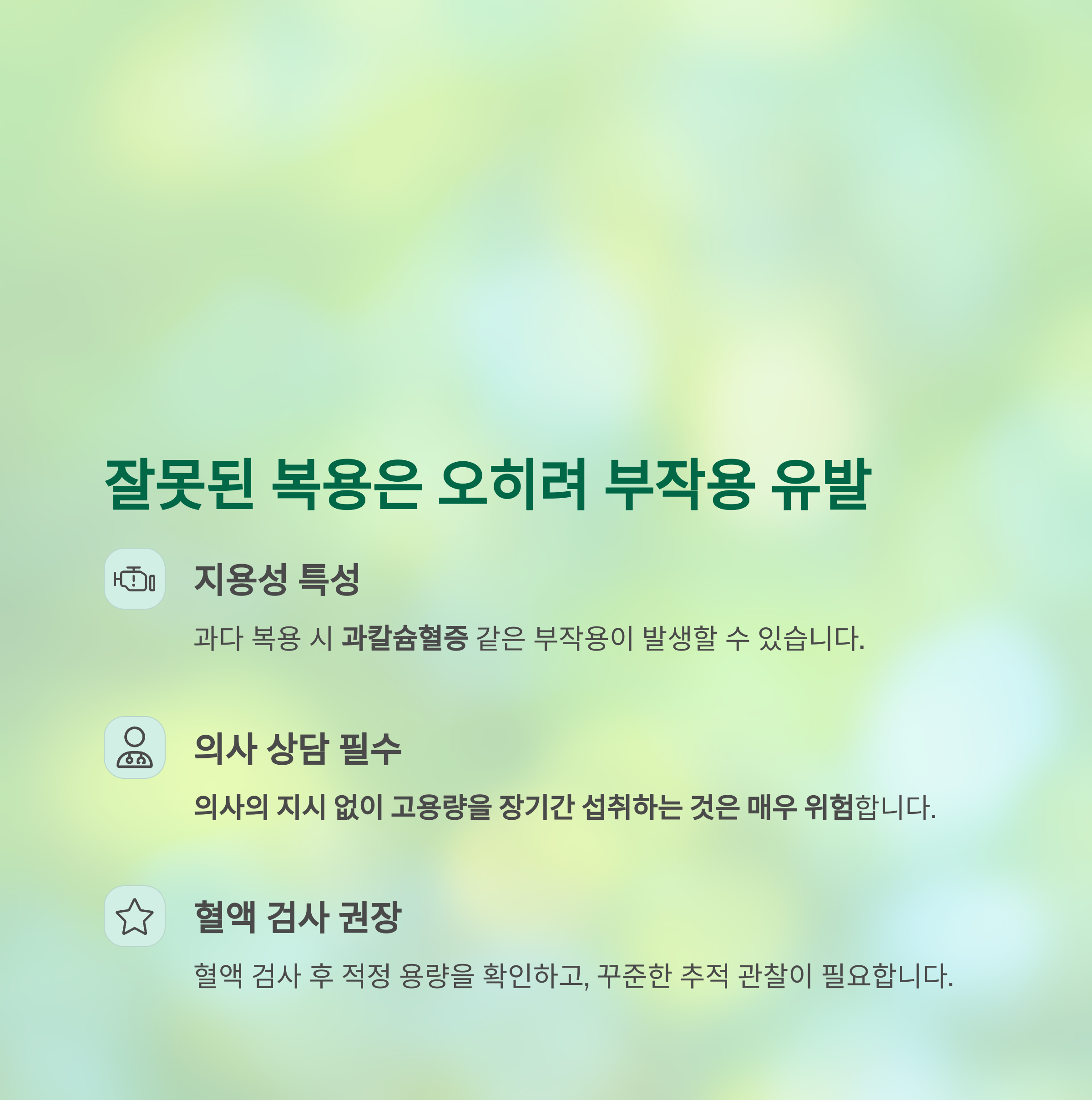 혈액 검사 후 적정 용량을 확인하고, 꾸준한 추적 관찰이 필요합니다.