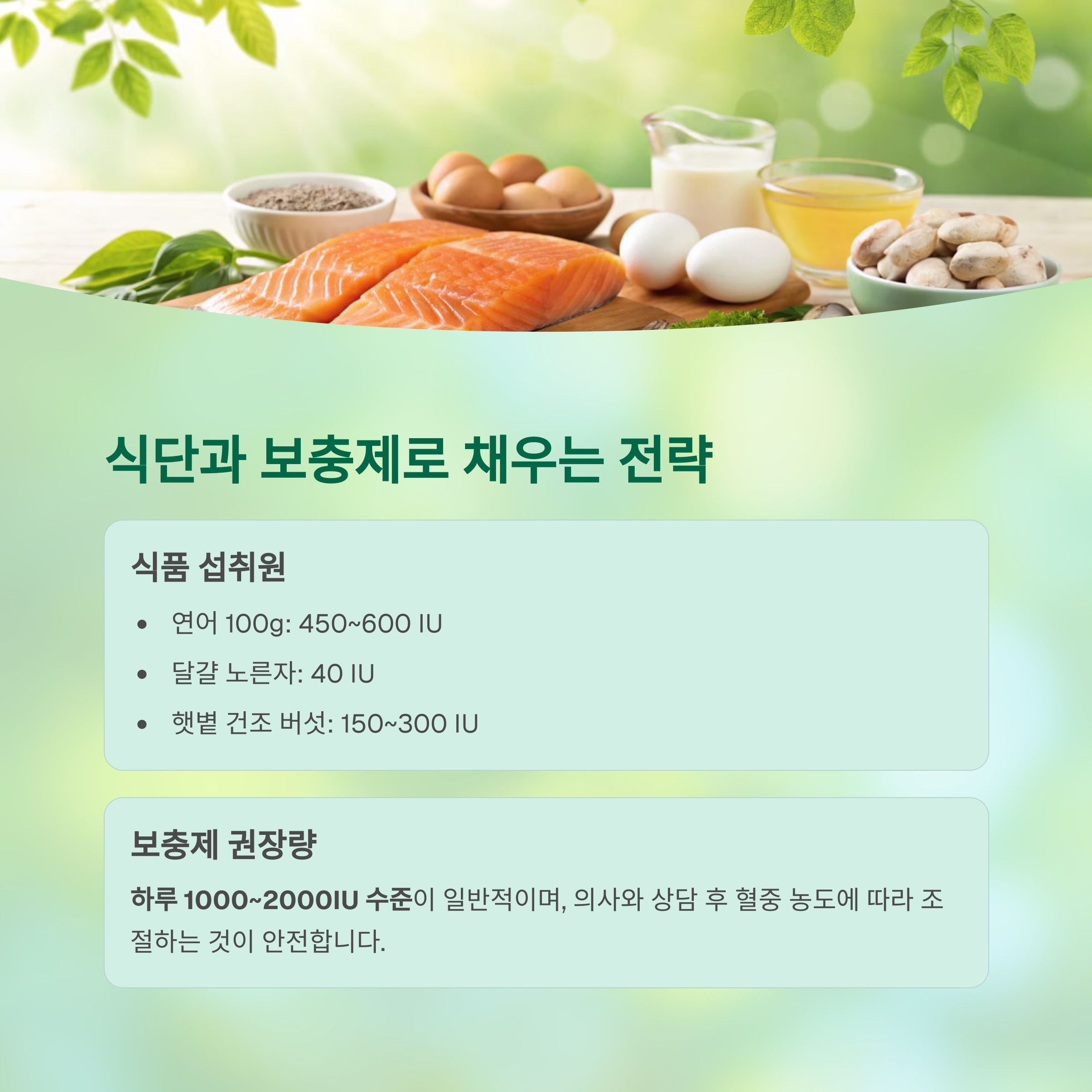 보충제는 하루 1000~2000IU 수준이 일반적인 권장량이며,