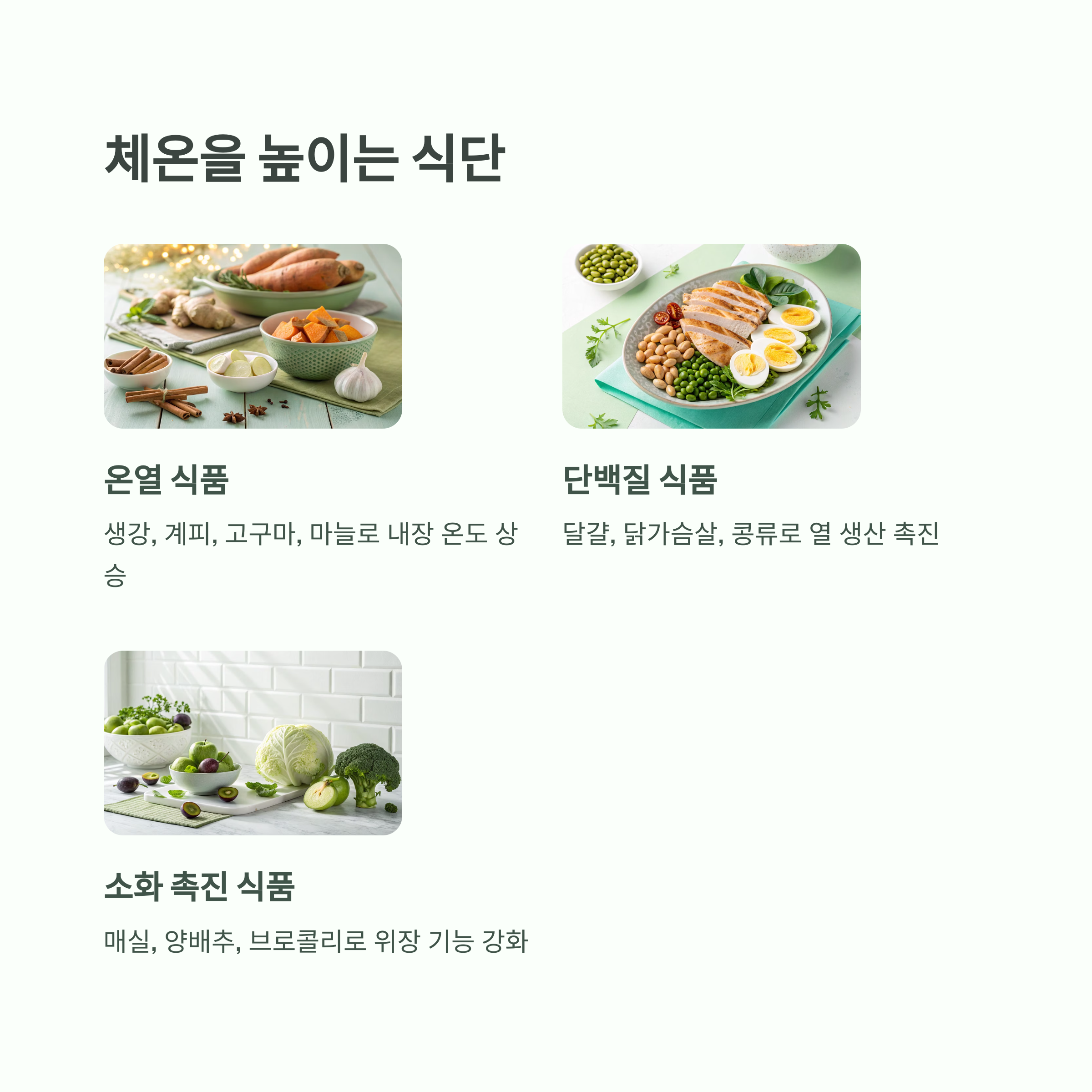 | 온열 식품 | 생강, 계피, 고구마, 마늘 | 내장 온도 상승, 혈관 확장 |