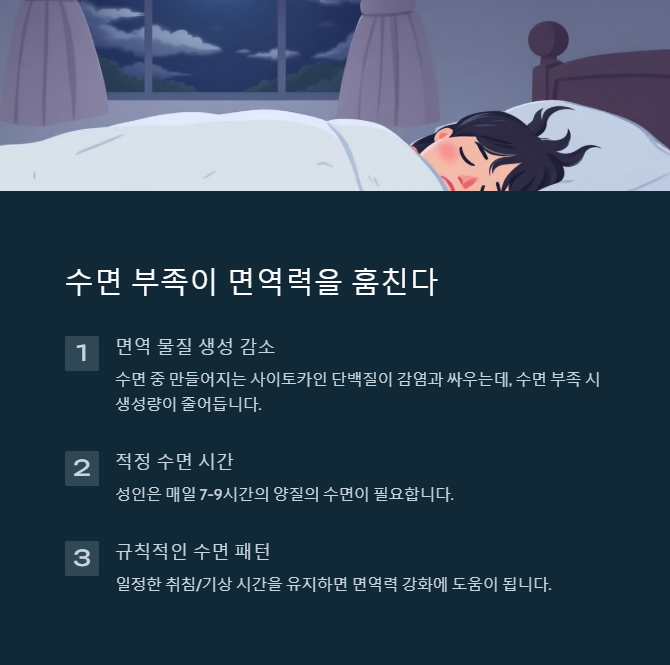 수면은 면역력과 직결된 가장 중요한 요소 중 하나예요. 밤늦게까지 스마트폰을 보거나 불규칙한 수면 패턴을 가지면 면역 체계가 약해질 수 있습니다.