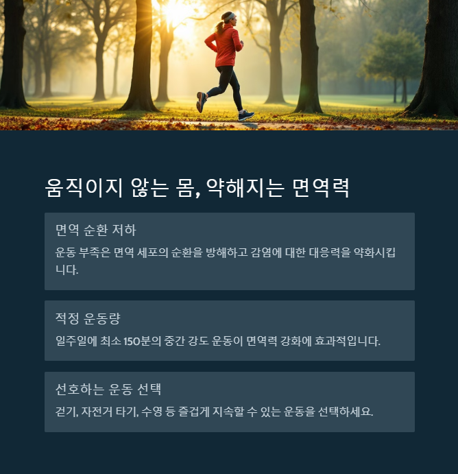 규칙적인 운동은 면역 세포의 활동을 증가시키고, 혈액순환을 원활하게 해 우리 몸이 바이러스와 싸울 준비를 할 수 있도록 도와줍니다. 하지만 운동 부족은 면역력 저하를 초래할 수 있어요.