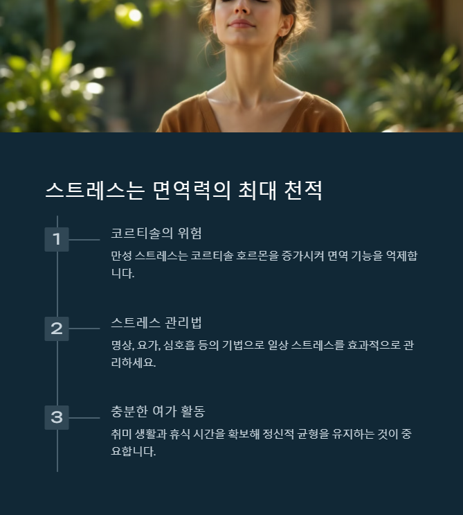 스트레스는 면역력을 급격히 떨어뜨릴 수 있는 가장 큰 요인 중 하나예요. 스트레스가 지속되면 몸의 염증 반응이 증가하고 면역 세포 기능이 저하될 수 있습니다. 따라서 명상, 취미 생활, 충분한 휴식이 필요합니다.