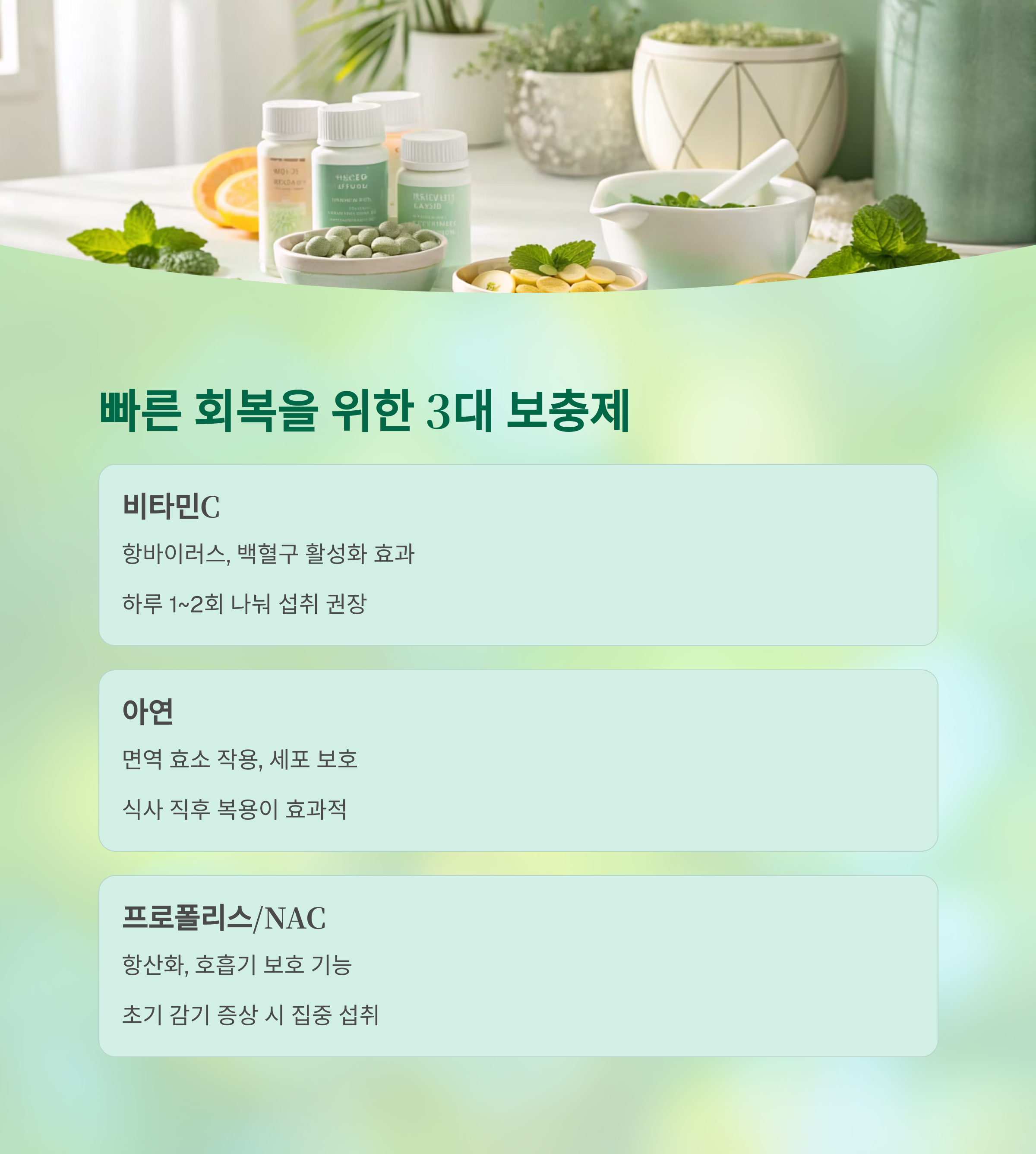 | 비타민C | 항바이러스, 백혈구 활성 | 하루 1~2회 나눠 섭취 |