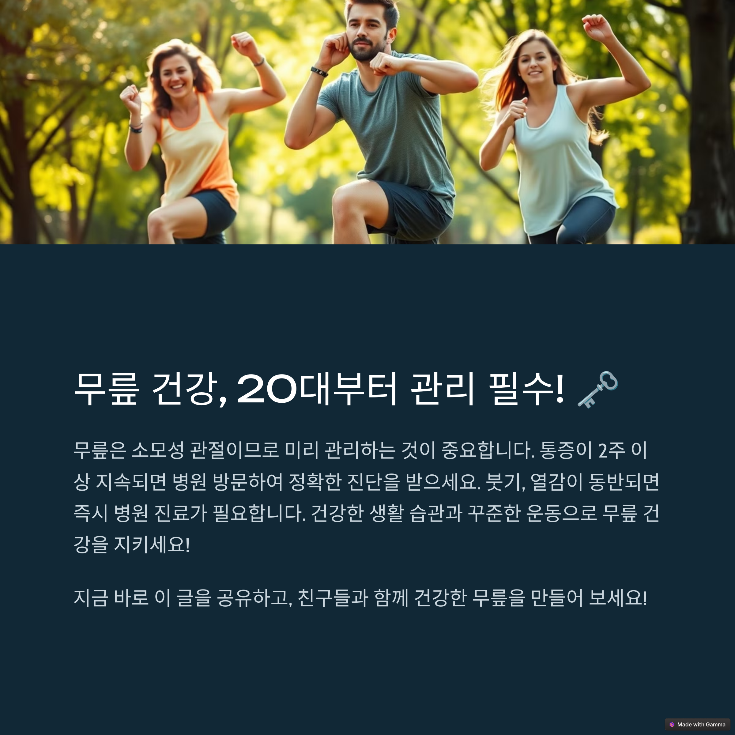 무릎은 소모성 관절이라 20대부터 관리하는 게 좋아요. 특히 운동 많이 하시는 분들은 필수예요!