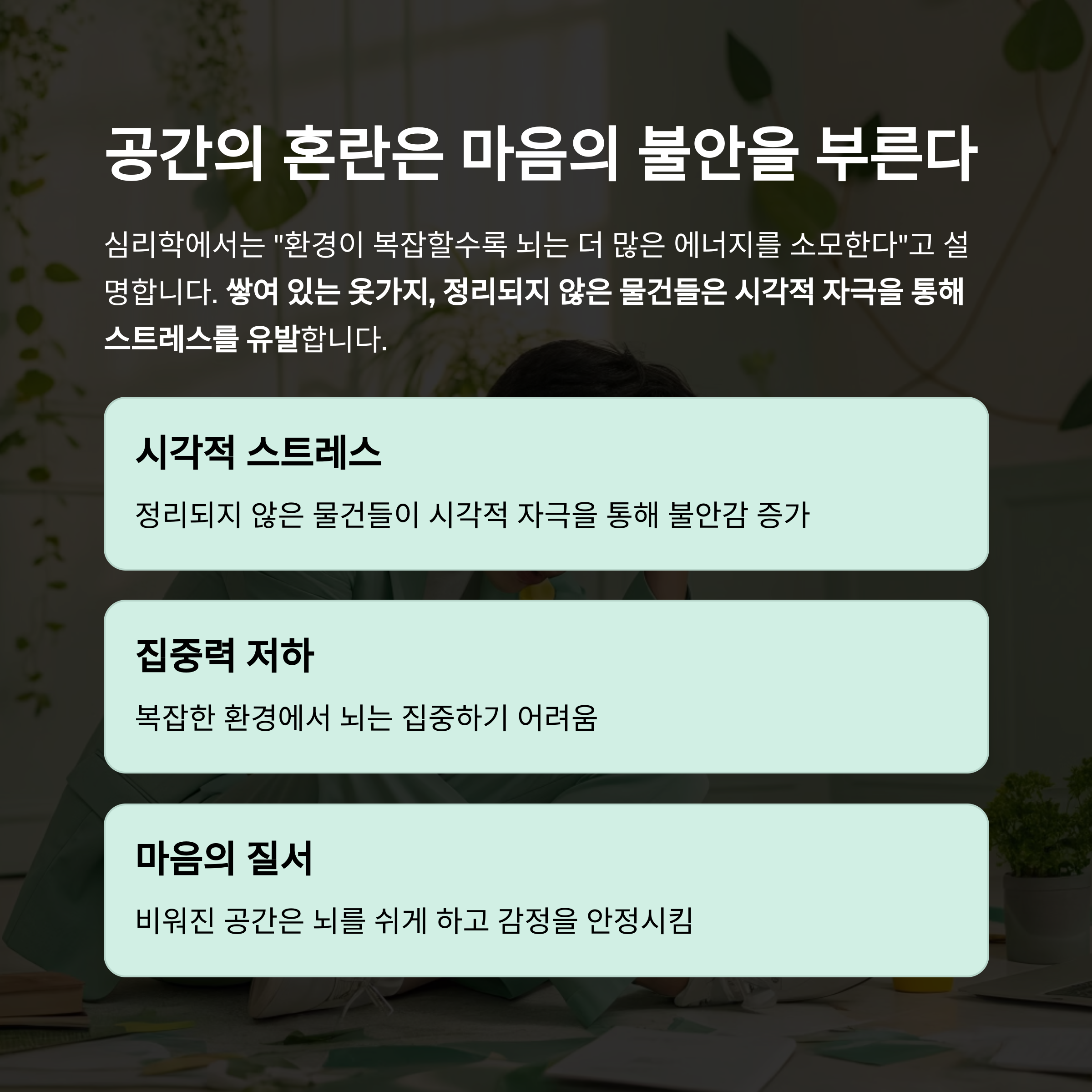 쌓여 있는 옷가지, 정리되지 않은 물건들은 시각적 자극을 통해 스트레스를 유발하고,