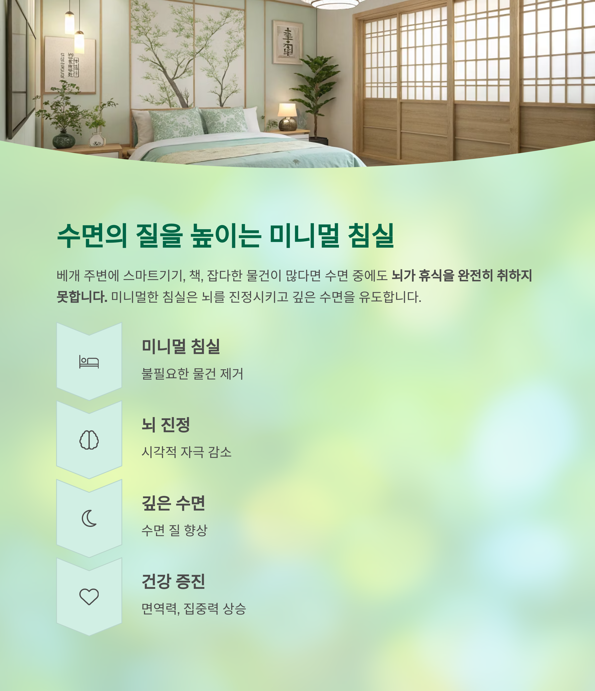 "미니멀한 침실은 뇌를 진정시키고, 깊은 수면 유도에 효과적"입니다.