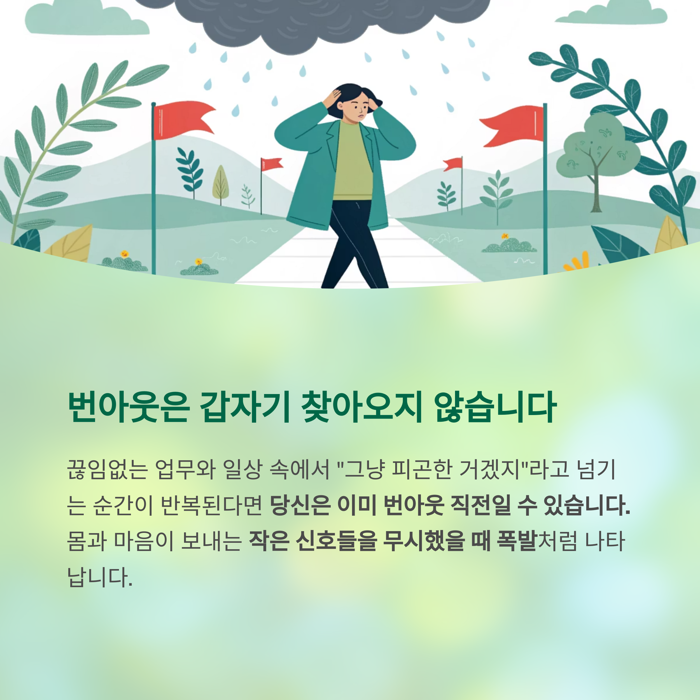 몸과 마음이 보내는 작은 신호들을 무시했을 때 폭발처럼 나타납니다.