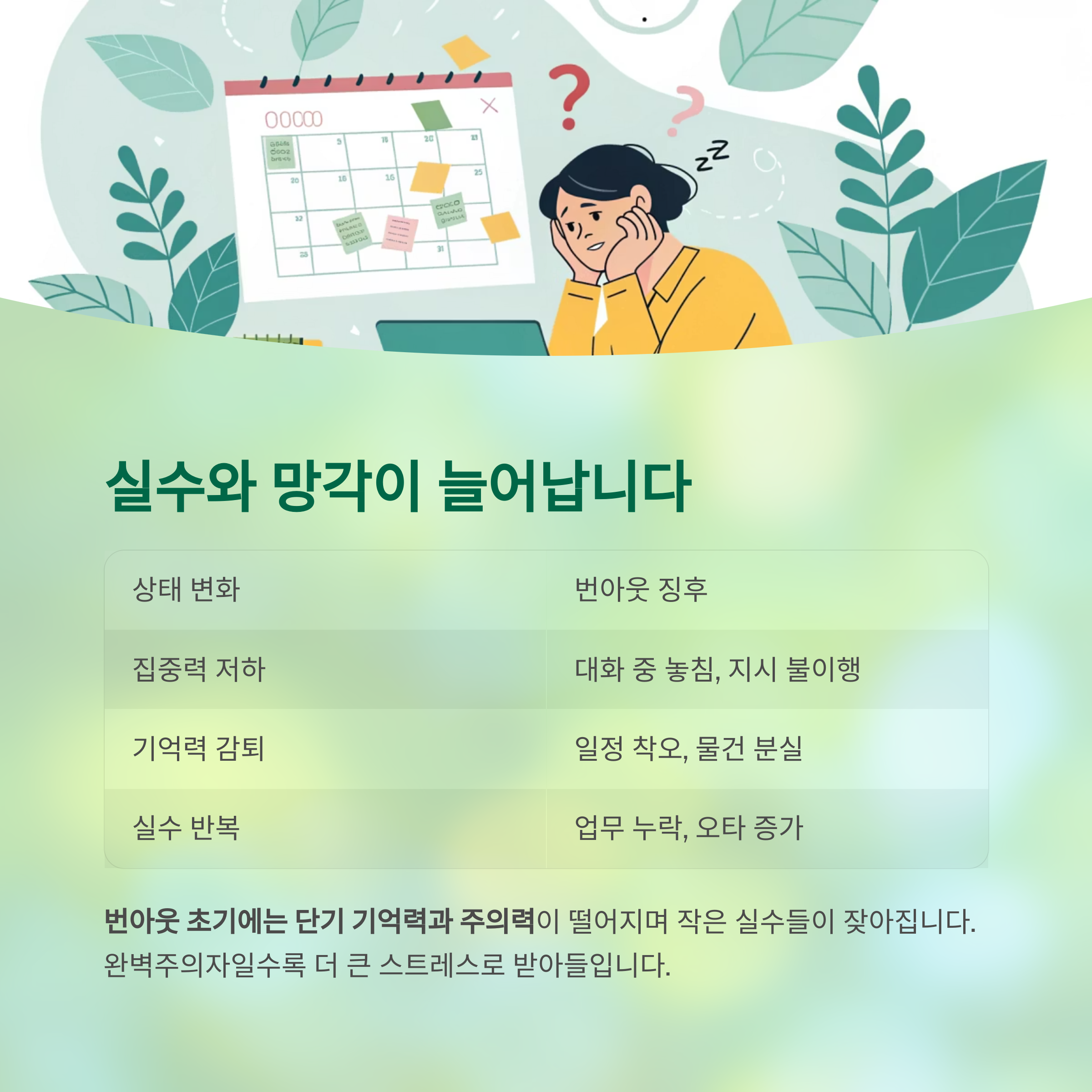 | 실수 반복 | 업무 누락, 오타 증가 |