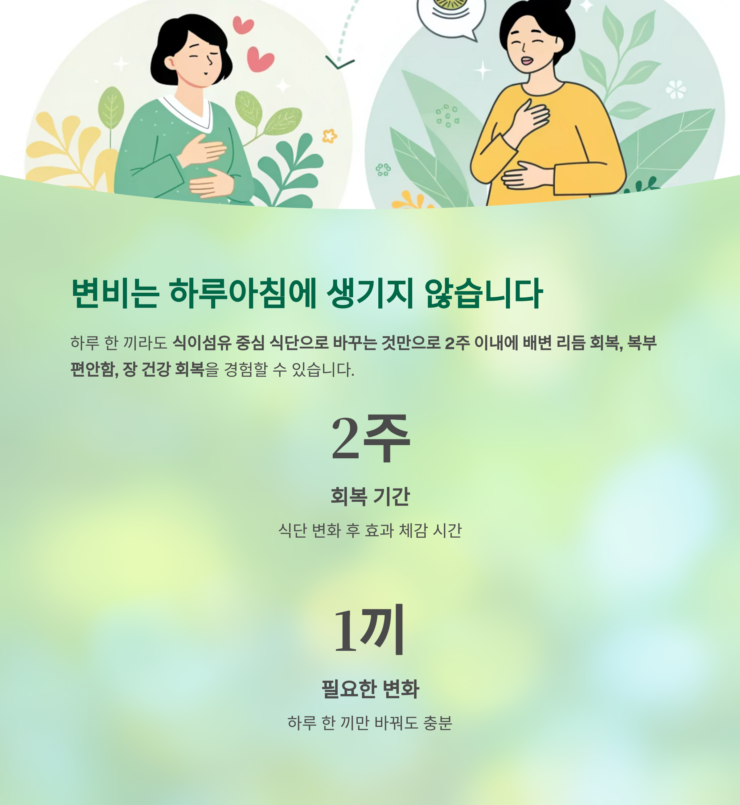 2주 이내에 배변 리듬 회복, 복부 편안함, 장 건강 회복을 경험할 수 있습니다
