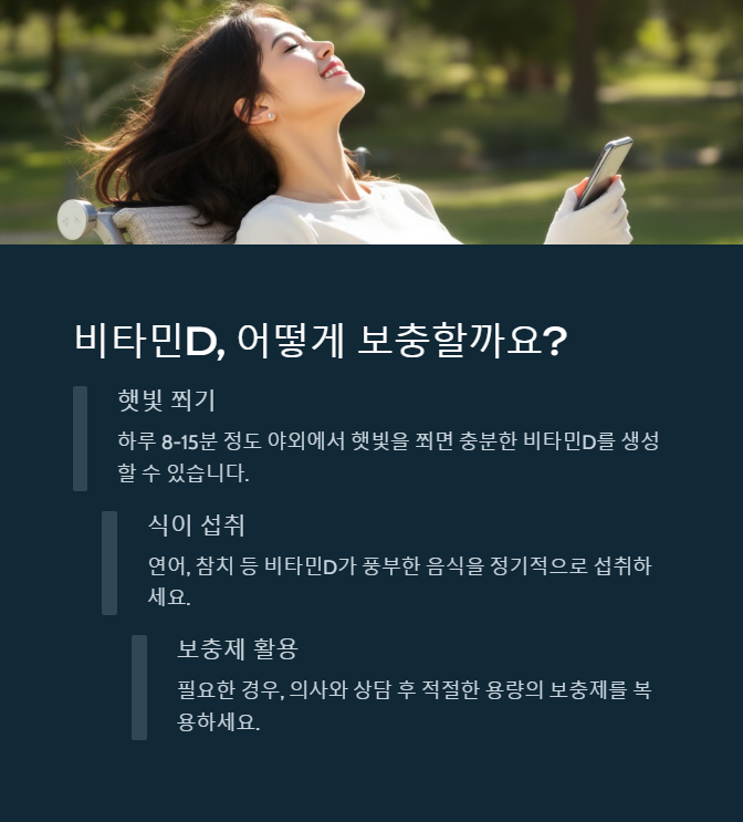 햇볕을 자주 쬐고, 비타민D가 풍부한 음식을 섭취하며, 필요할 경우 영양제도 활용해 보세요.