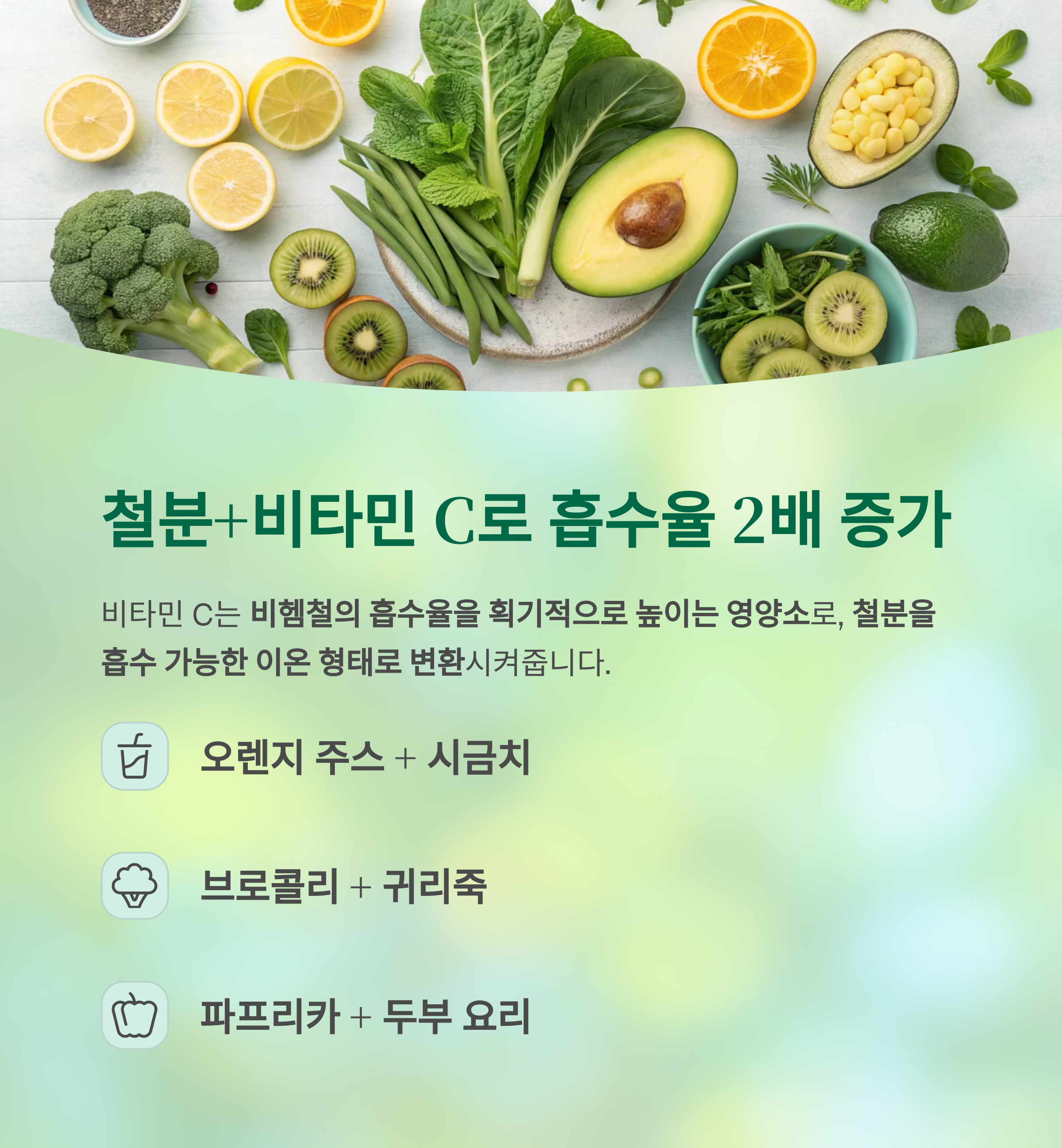 비타민 C는 철분, 특히 비헴철의 흡수율을 획기적으로 높이는 영양소입니다