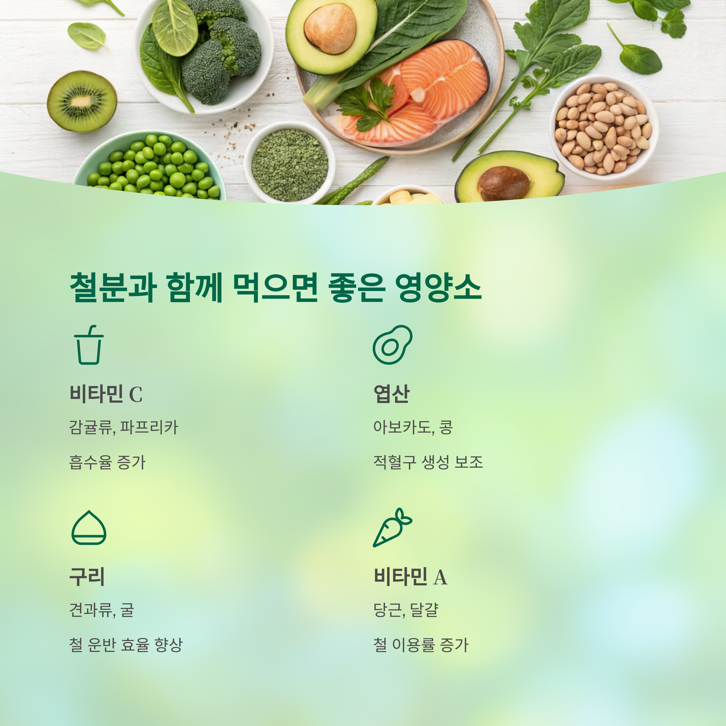 | 비타민 A | 당근, 달걀 | 철 이용률 증가 |