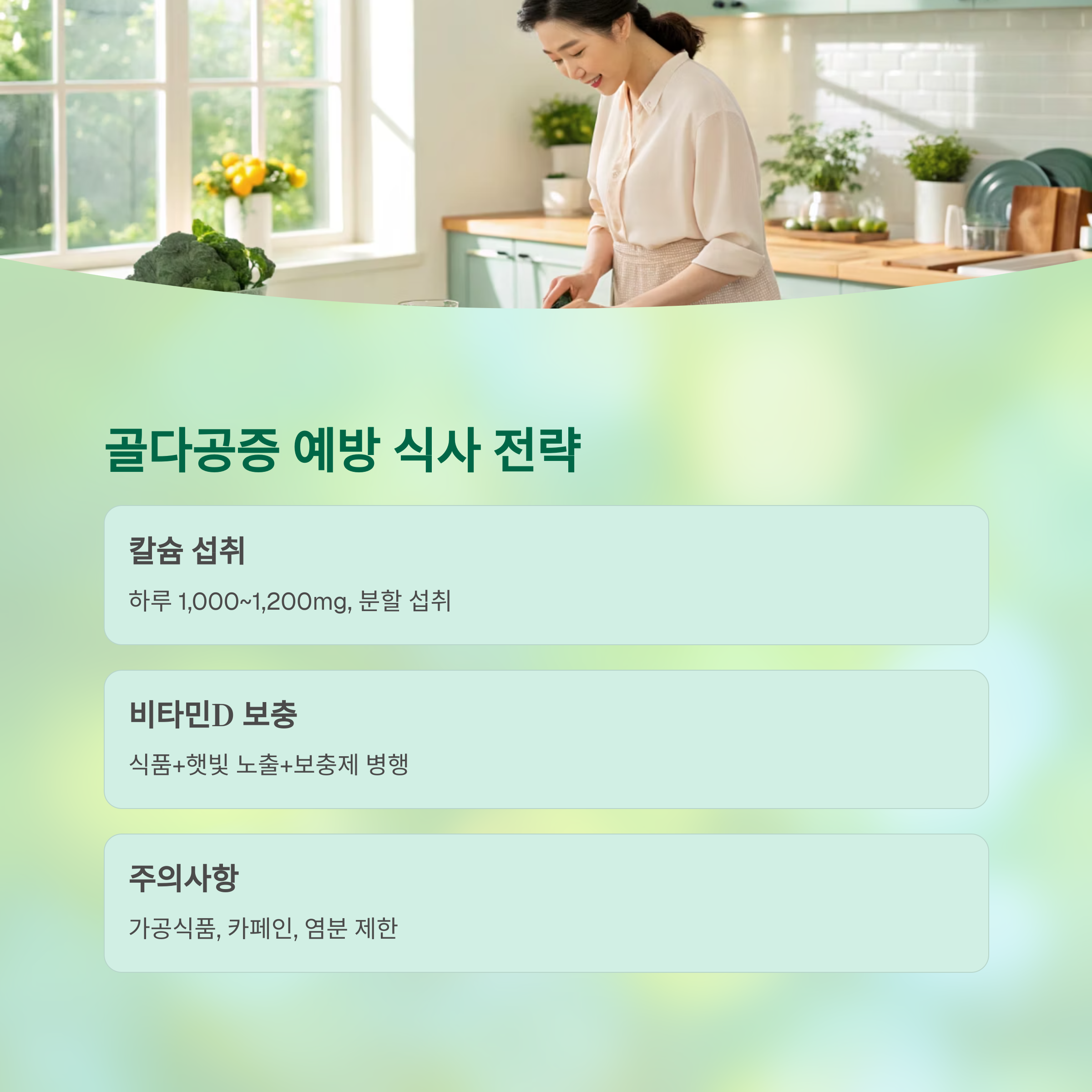 | 카페인·염분 조절 | 과다 섭취 시 칼슘 배출 증가 가능성 |