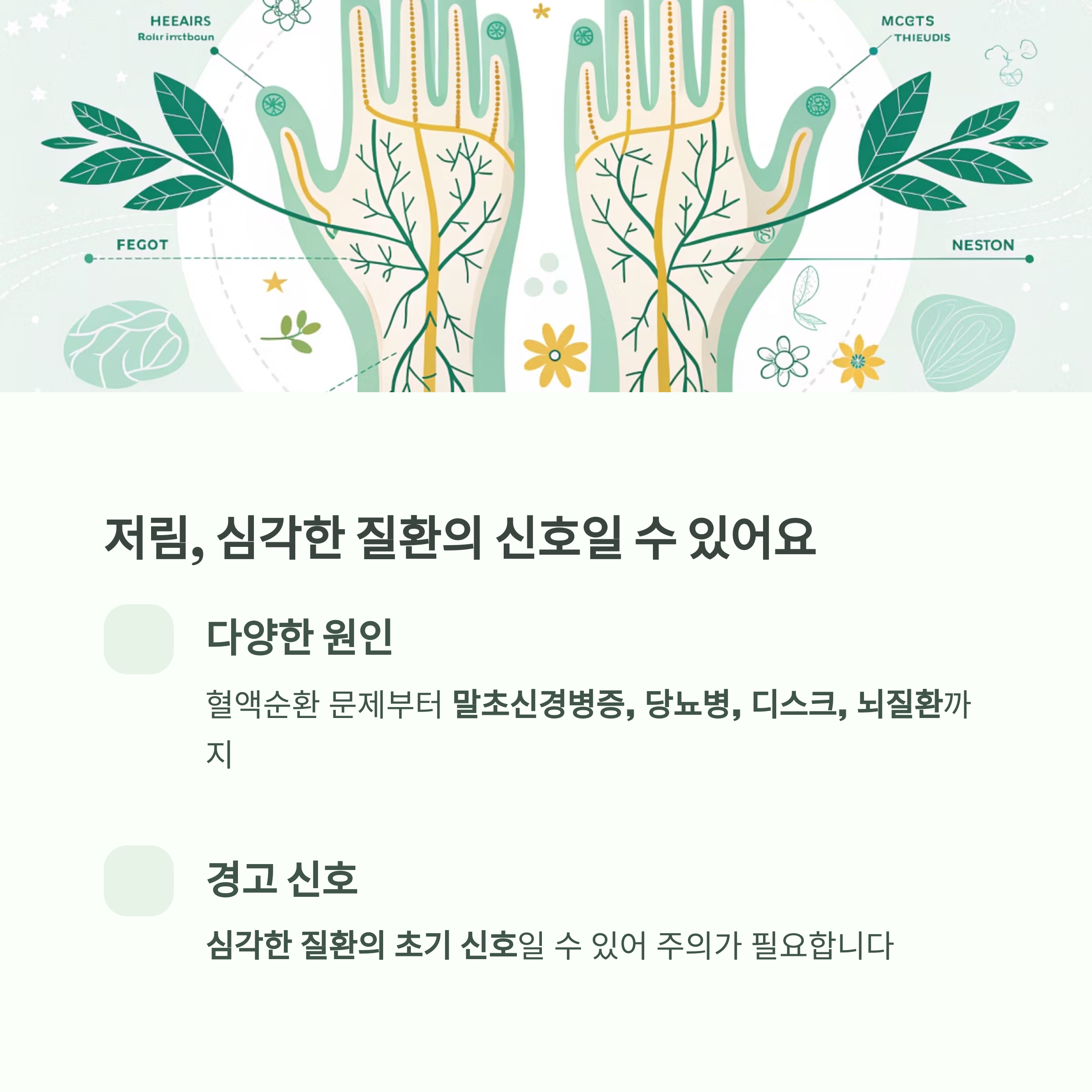 손발이 저린 증상은 많은 사람들이 가볍게 넘기기 쉽지만, 실제로는 심각한 질환의 초기 신호일 수 있습니다.