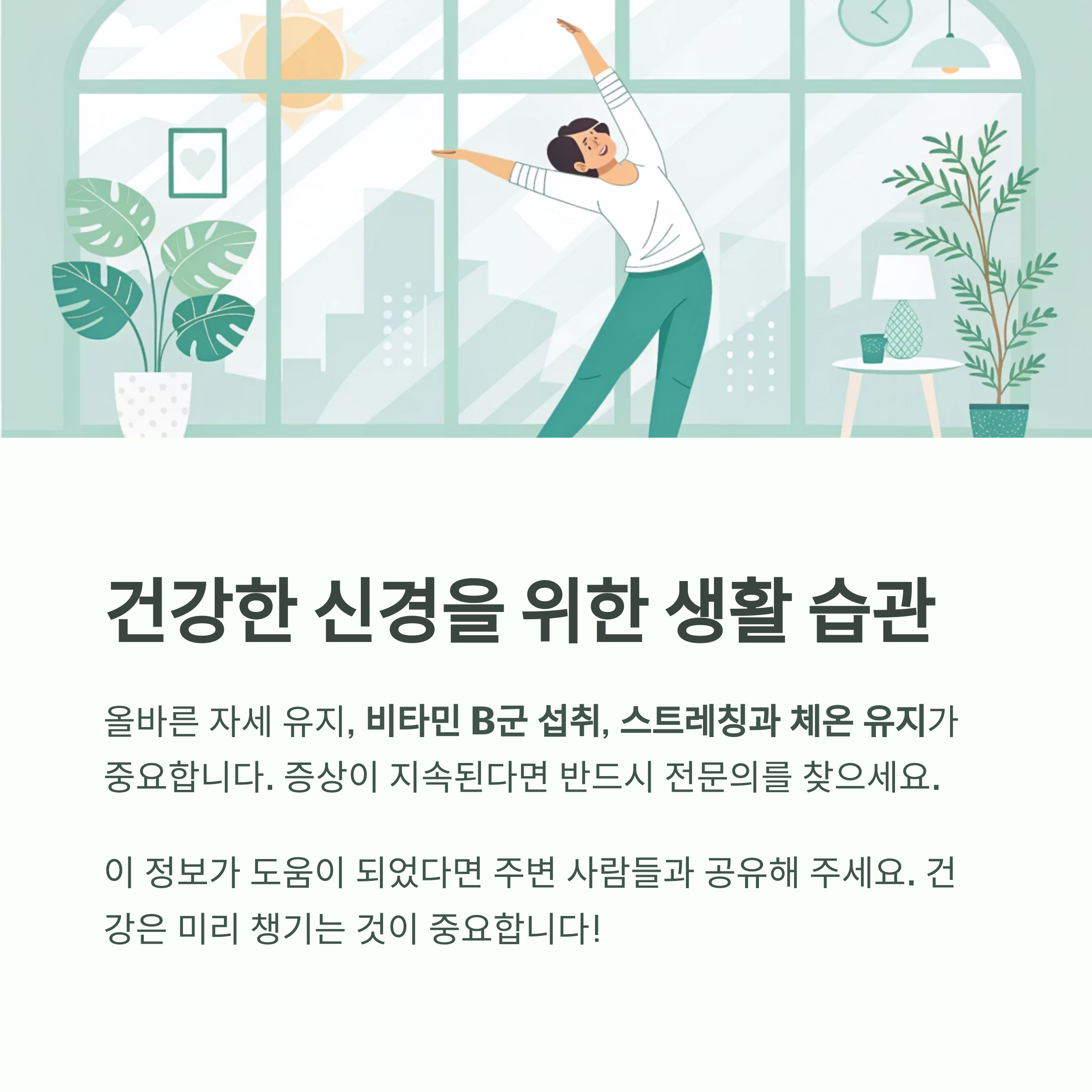 | 신경 문제 | 찌릿함, 감각 둔화, 근력 저하 | 신경 재활, 약물 치료 |