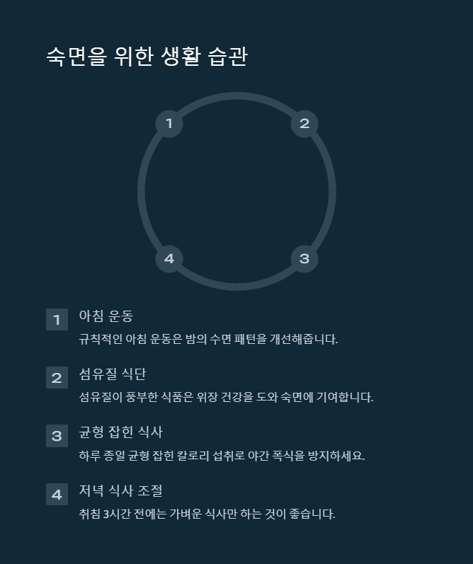 음식뿐만 아니라 생활 습관도 숙면에 중요한 영향을 미칩니다.