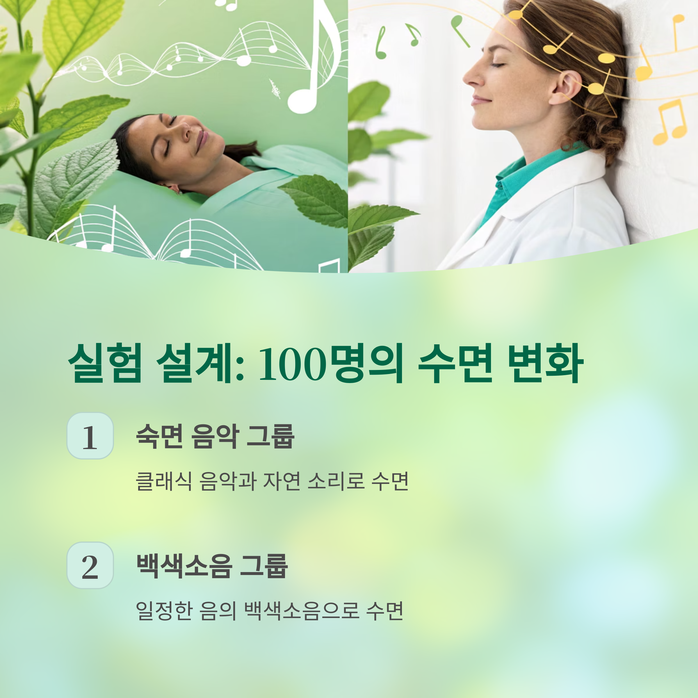 숙면 음악과 백색소음의 수면 질 효과를 비교하기 위해 3개월간 수면장애가 있는 성인 100명을 두 그룹으로 나누었습니다 첫 번째 그룹은 클래식 음악과 자연 소리가 포함된 숙면 음악을 들었으며, 두 번째 그룹은 일정한 음의 백색소음을 들으며 수면을 취했습니다 하루 평균 7시간 수면을 목표로 하고 수면 중 뇌파와 깊은 잠의 비율, 수면 중 각성 횟수 등을 측정했습니다