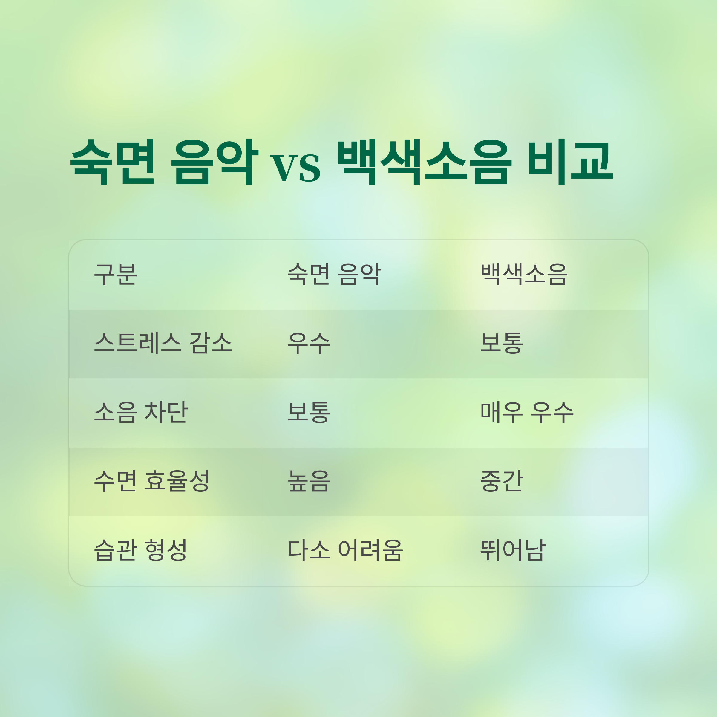 단기적으로 스트레스가 심한 날이나 심리적으로 불안할 때는 숙면 음악이 더 효과적이며, 매일 규칙적이고 장기적인 습관을 형성하고 싶다면 백색소음을 추천합니다 자신의 환경과 필요에 맞춰 최적의 수면 환경을 선택해 보세요