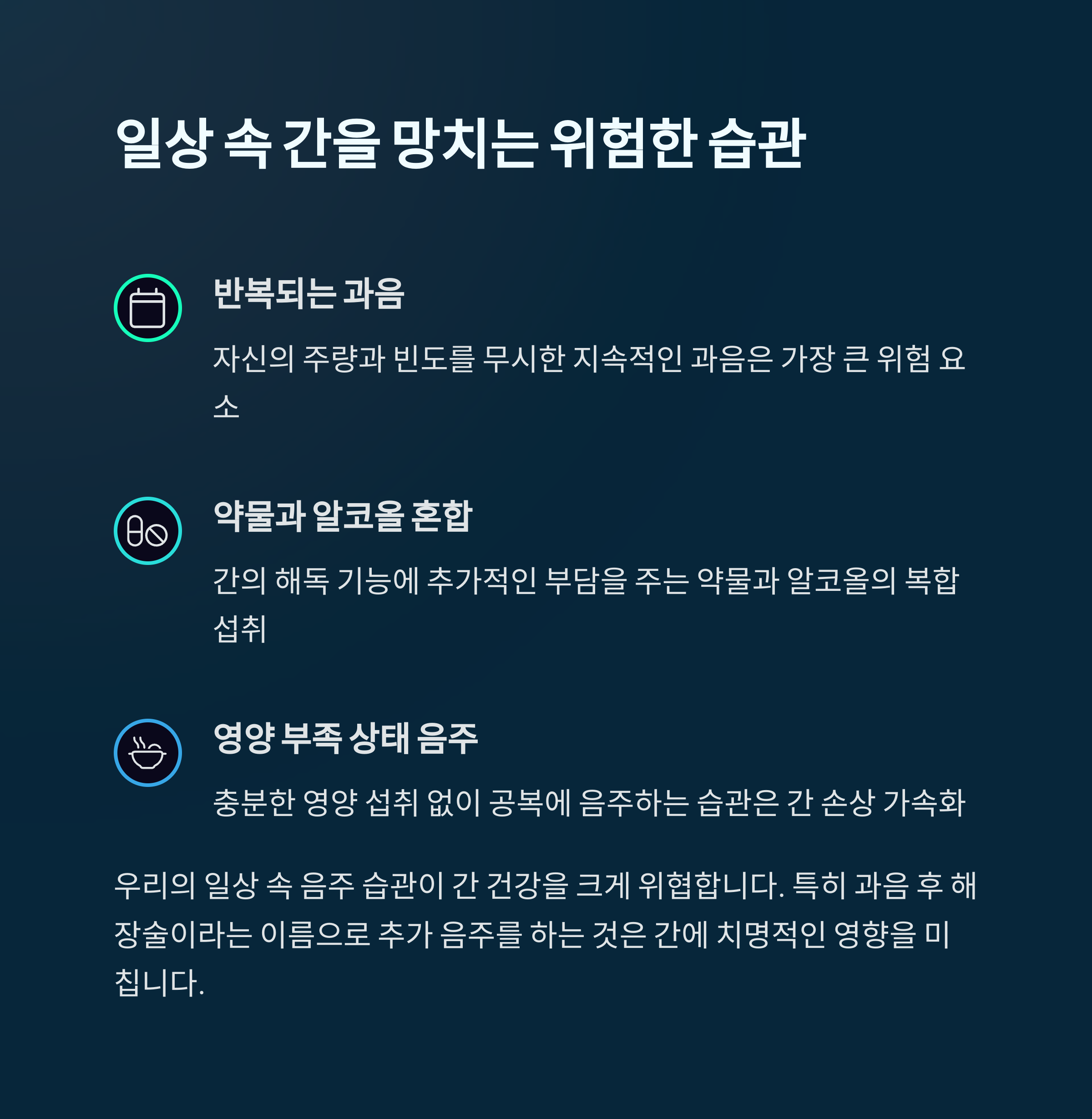 특히 지속적인 음주는 간 기능 저하와 함께 치명적인 손상을 가져올 수 있습니다.