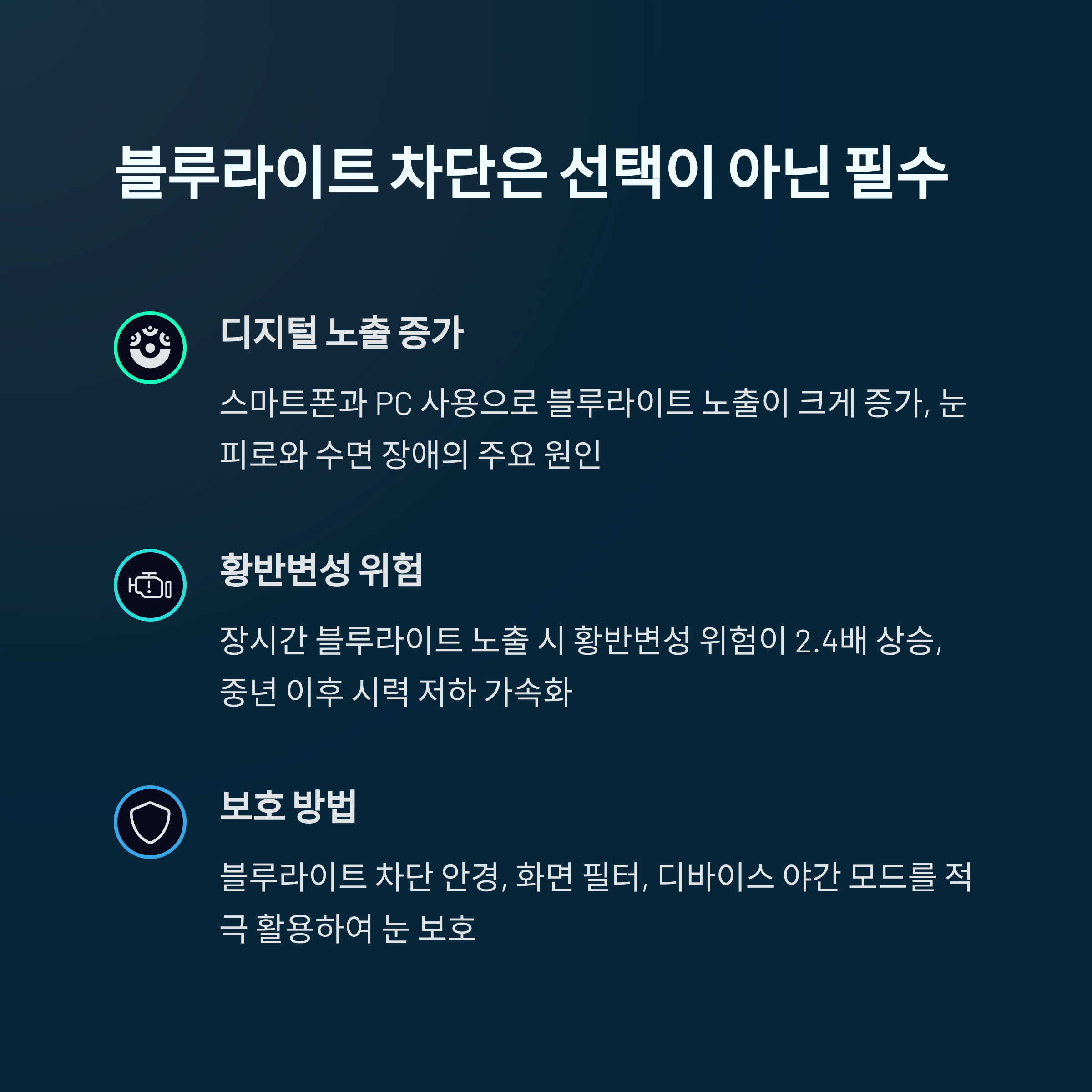 중년 이후에는 블루라이트 차단 필름이나 안경을 적극적으로 사용하는 것이 매우 중요합니다. 🌟