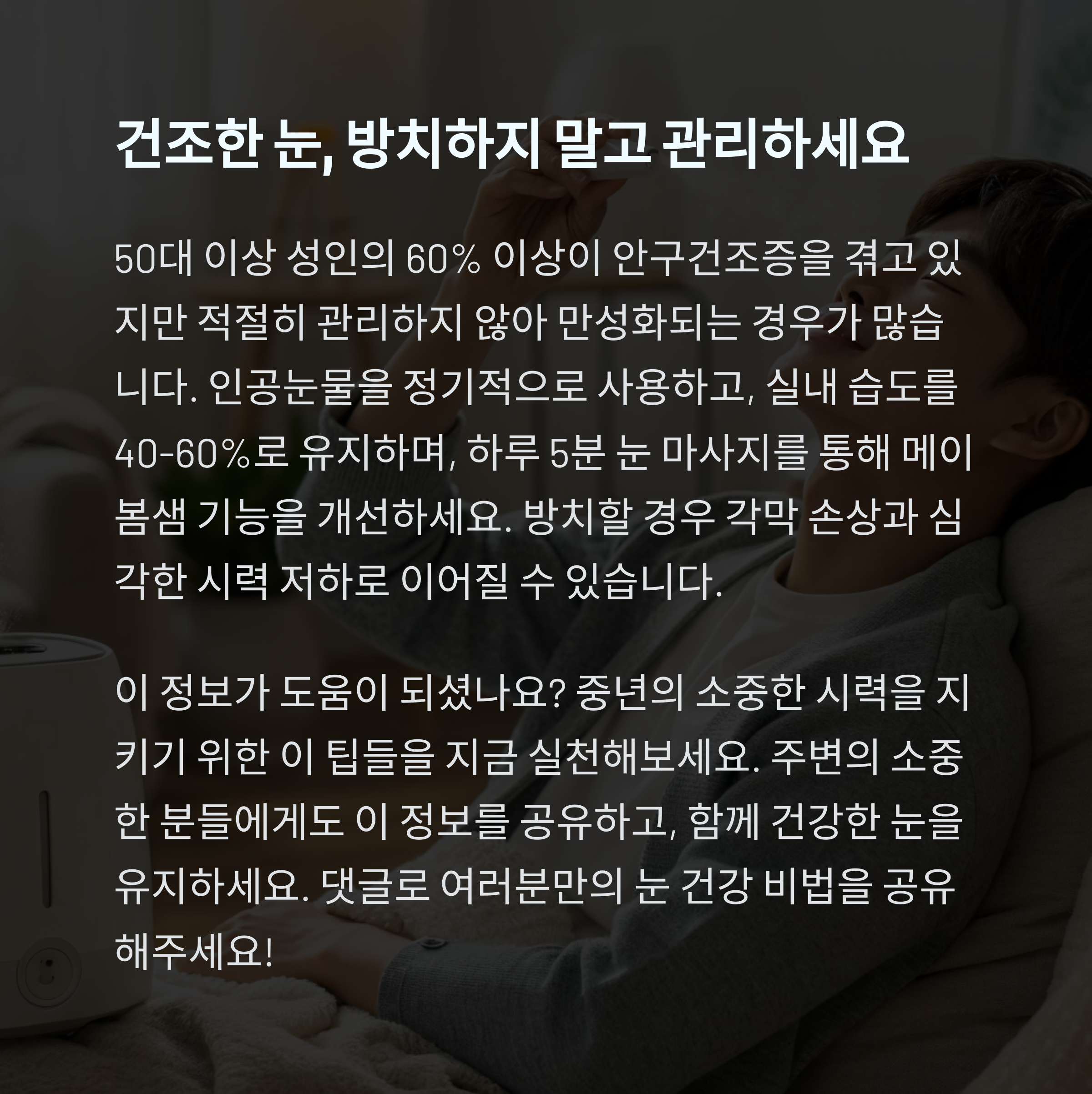 "인공눈물 사용과 적절한 실내 습도 유지"가 중요합니다.