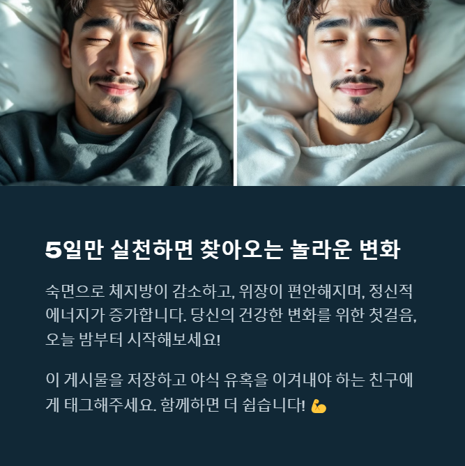 솔직히 야식 참는 거, 말처럼 쉽지 않죠. 하지만 저도 해냈고, 여러분도 충분히 할 수 있어요. 그 유혹의 순간, 냉장고를 여는 대신 조명을 끄고 눈을 감아보세요. 배고픔은 금방 잊히지만, 숙면은 다음 날을 완전히 바꿔줍니다. 오늘부터 단 5일만이라도 실천해 보세요. 놀랍게도, 몸도 마음도 ‘야식 없이도 괜찮다’고 느끼기 시작할 거예요. 그때부터가 진짜 변화의 시작입니다.