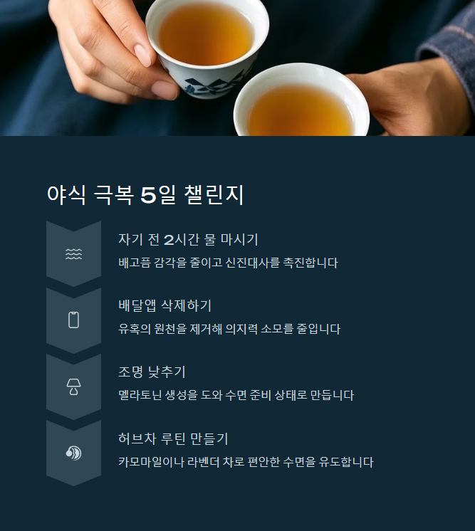 습관을 바꾸는 가장 강력한 방법은 ‘루틴’이에요. 특히 저녁 시간대를 통제하면 야식 유혹도 사라지기 시작합니다.