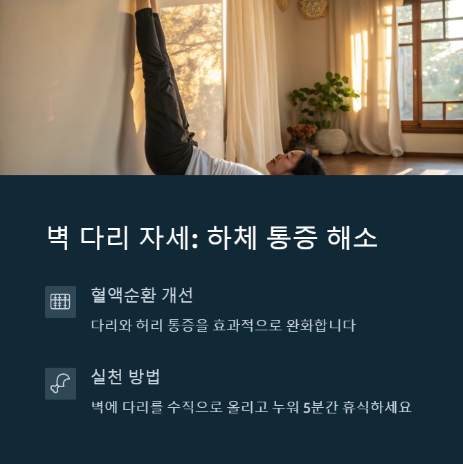 | 벽 다리 자세 (Viparita Karani) | 하체 부기 제거, 혈액순환 개선, 허리 이완 |