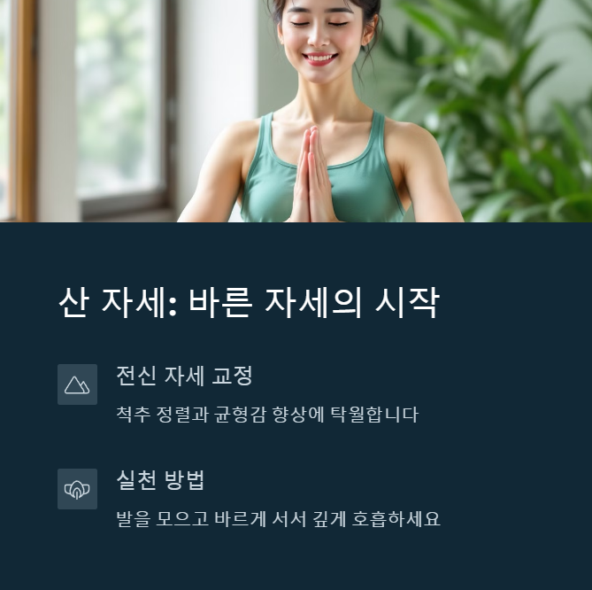 - 산 자세 (Tadasana) – 자세 교정과 척추 정렬에 효과적