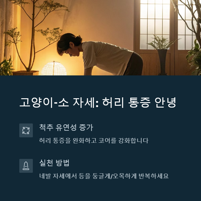 - 고양이-소 자세 (Cat-Cow) – 허리 통증 완화와 유연성 증가