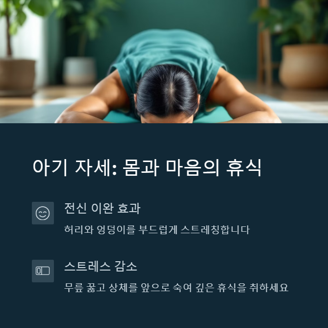 - 아기 자세 (Balasana) – 전신 이완과 긴장 완화