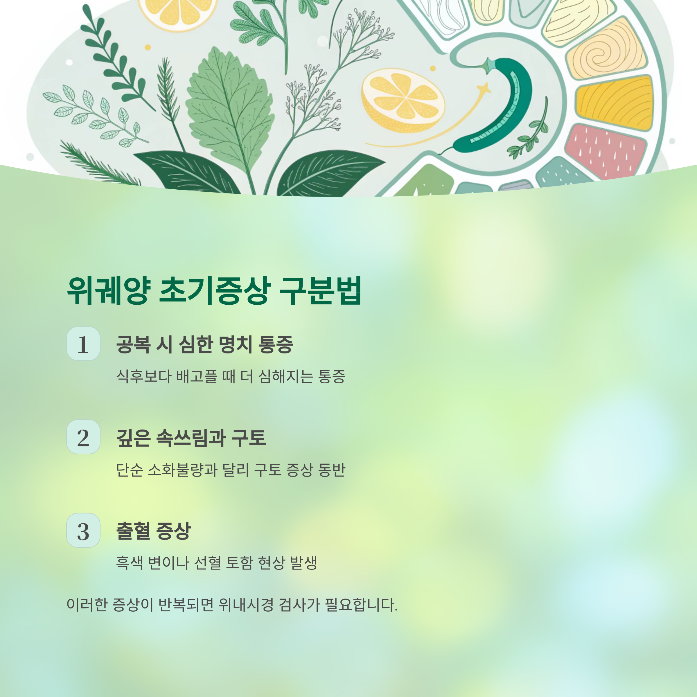 | 통증 | 간헐적 불편감 | 공복 시 극심한 복통 |