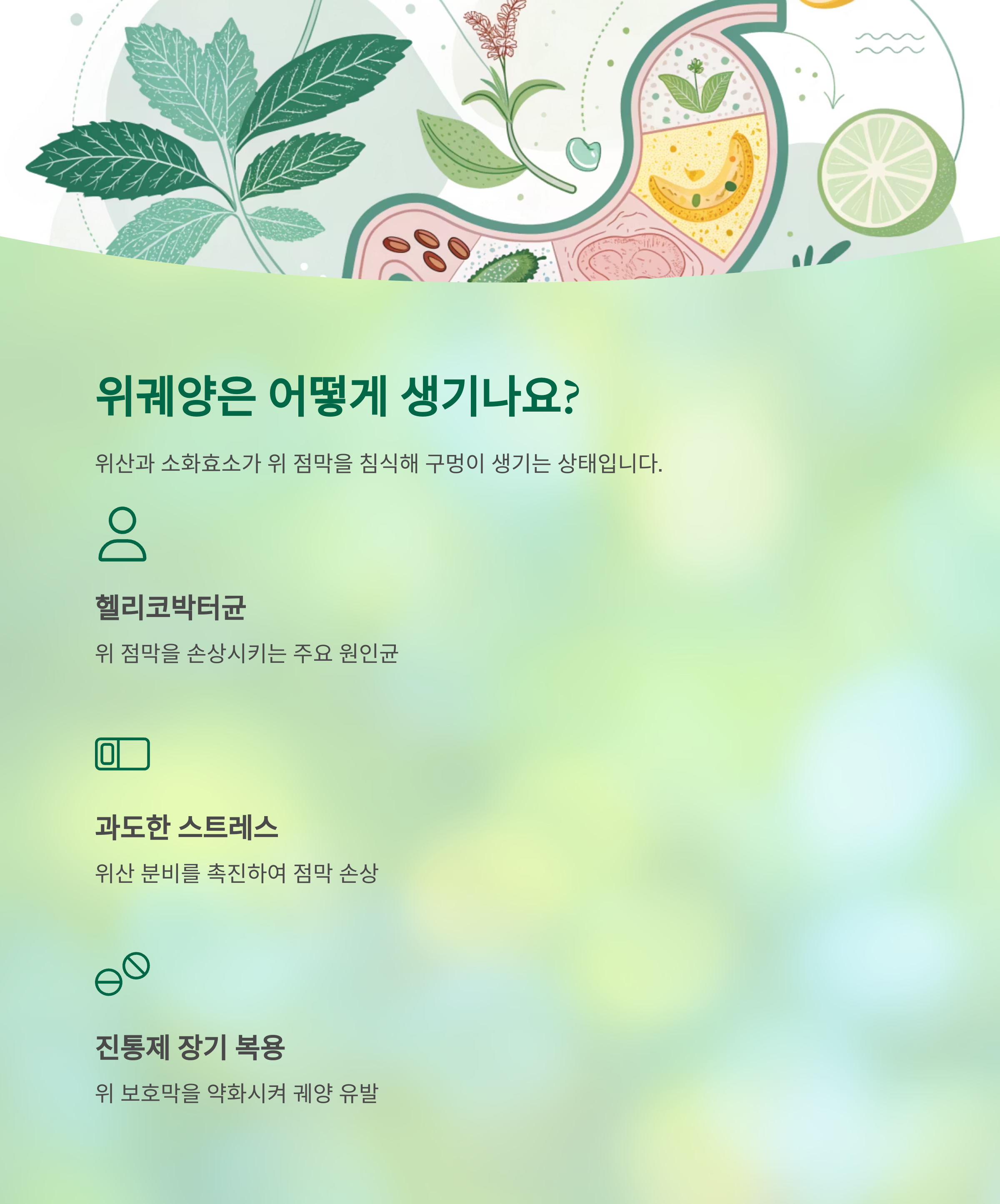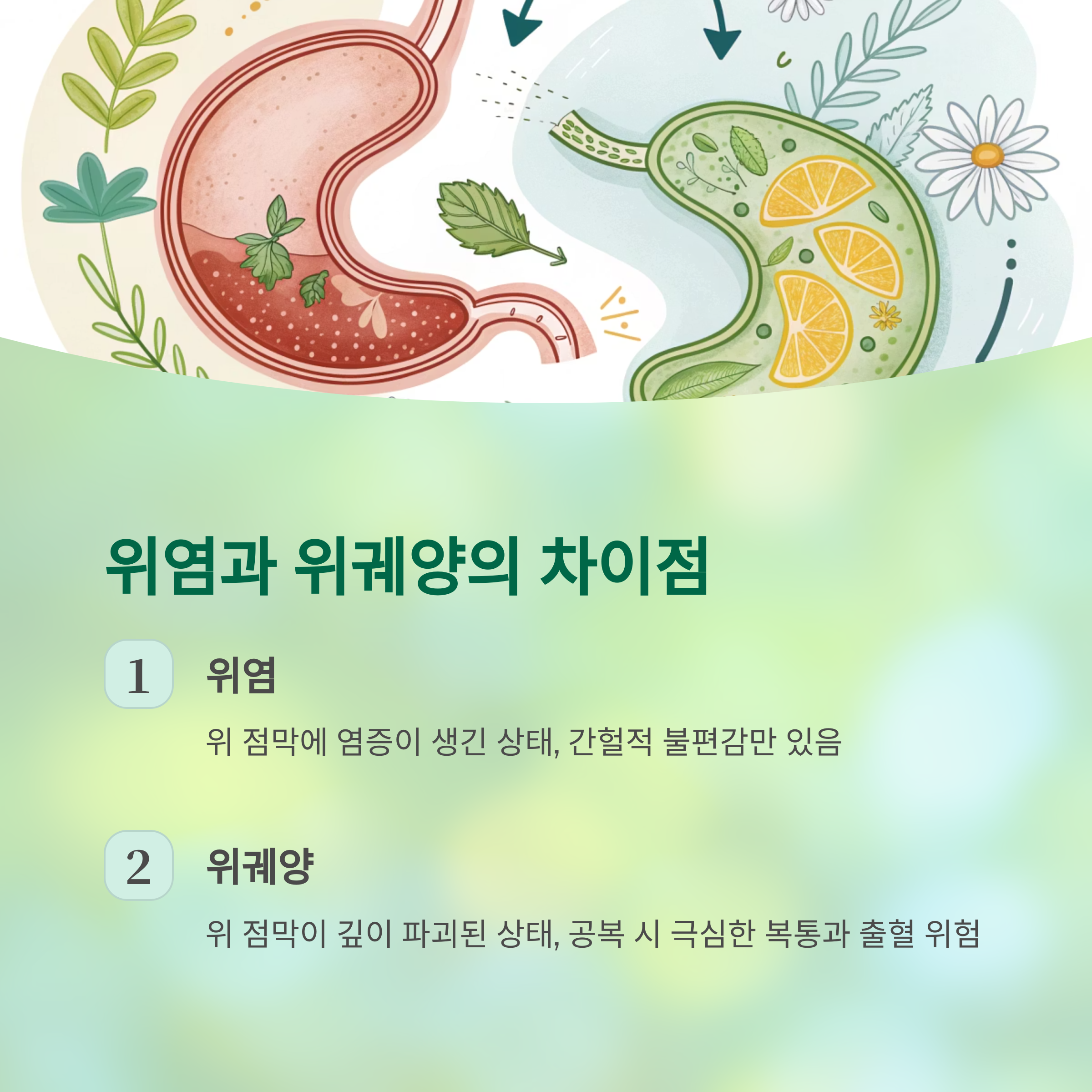 위염은 위 점막에 염증이 생긴 상태이고, 위궤양은 위 점막이 깊이